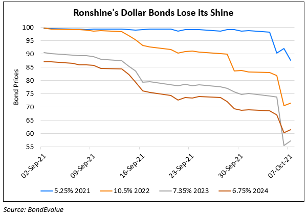 Ronshine is said to have hired Guotai Junan Securities as its financial adviser and Linklaters as legal adviser for a proposed debt exchange of its $456.5mn 10.5% dollar bonds due March 1, 2022, as per Debtwire. The bonds were up 2.4 points to 63.9 cents on the dollar. Further, Ronshine is also said to be seeking an extension on two other dollar bonds via an exchange offer – its $688mn 8.75% bond due October 2022, and its $415mn 8.95% bond due January 2023. However, there was no exchange filing related to this on HKEX as of the time of writing.