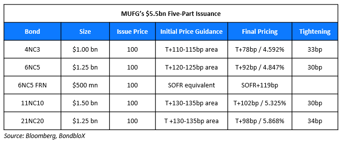 MUFG raised $5.5bn via a five trancher. It raised: