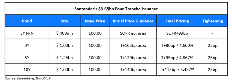 Santander raised $3.65bn via a four-part deal.