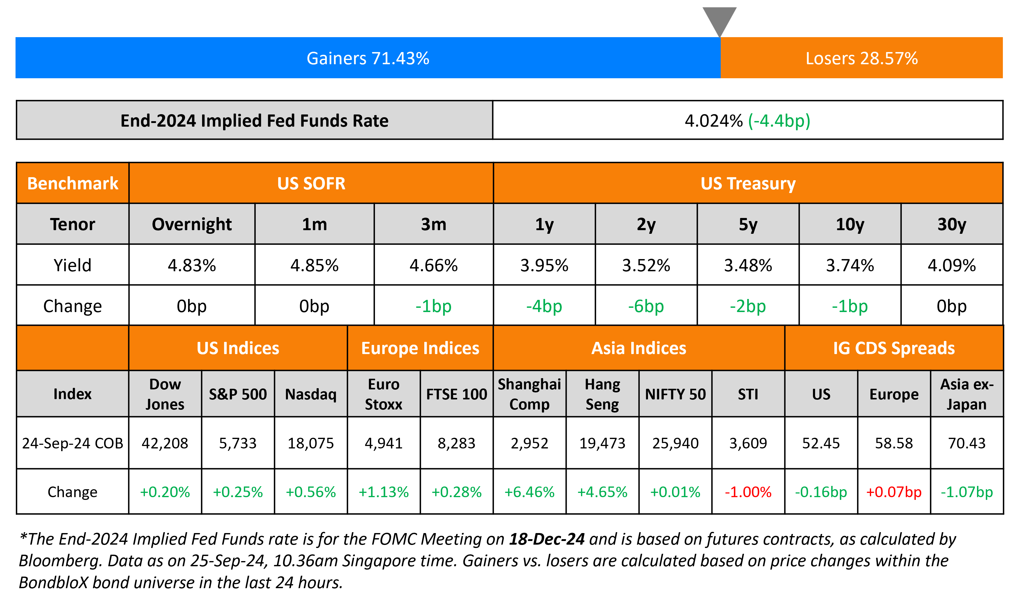 US Treasuries yields inched lower for shorter tenors while longer term yields held largely steady. This comes after a solid 2Y auction that was held yesterday. The auction saw a bid-to-cover ratio of 2.59x, and an indirect acceptance rate of 67.6%. The 2Y yield fell by 4.9bp and now sits at 3.52%. In other news, Fed Reserve Governor Michelle Bowman also remarked on the rate cut decision last week. She said that the Fed should go about the cuts at a “measured pace”, amid lingering inflation risks and the lack of significant weakening in the labour market. Markets are now pricing in close to 80bp in cuts by end of this year as per the end-2024 Future Fed Funds Rate. US IG and HY CDS tightened by 0.2bp and 2.4bp respectively. Looking at US equity indices, the S&P and NASDAQ closed higher by 0.25% and 0.2% respectively.