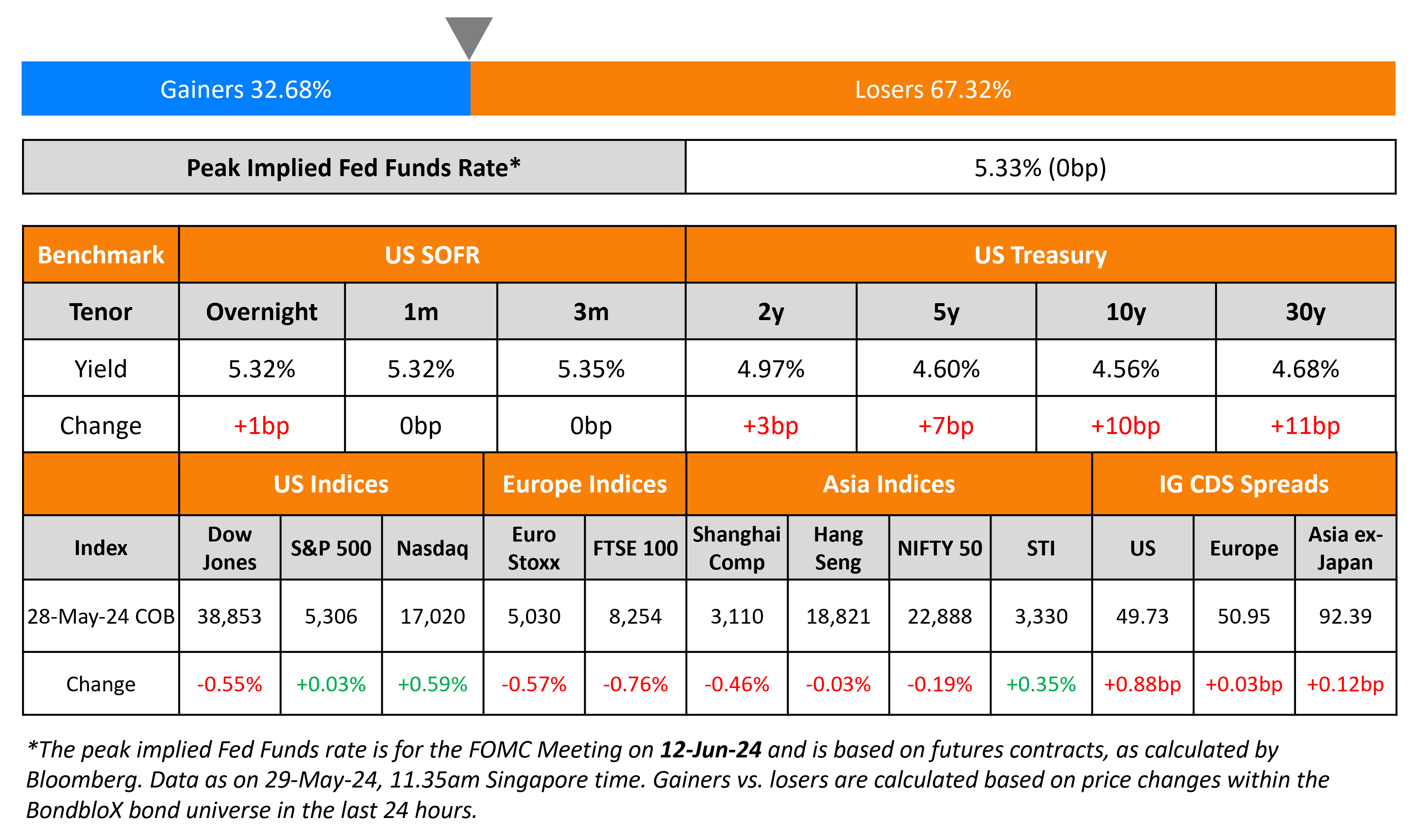 US Treasury yields moved higher across the curve on Tuesday as markets resumed after the extended weekend. The US Consumer Confidence Index rose to 102 in May vs. expectations of 96 and the prior 97.5 reading. This was the first increase after three consecutive months of decline. Also, the average 1Y inflation expectations ticked higher to 5.4% from 5.3%. Separately, Minneapolis Fed President Neel Kashkari said that he and other members have not ruled out the possibility of additional rate increases, albeit with the odds of that being “quite low”. He added that he has not gained confidence about the disinflation process since the March FOMC meeting. Equity markets saw the S&P close almost unchanged while the Nasdaq was up 0.6%. US IG CDS spreads widened 0.9bp and HY spreads were 3.3bp wider.