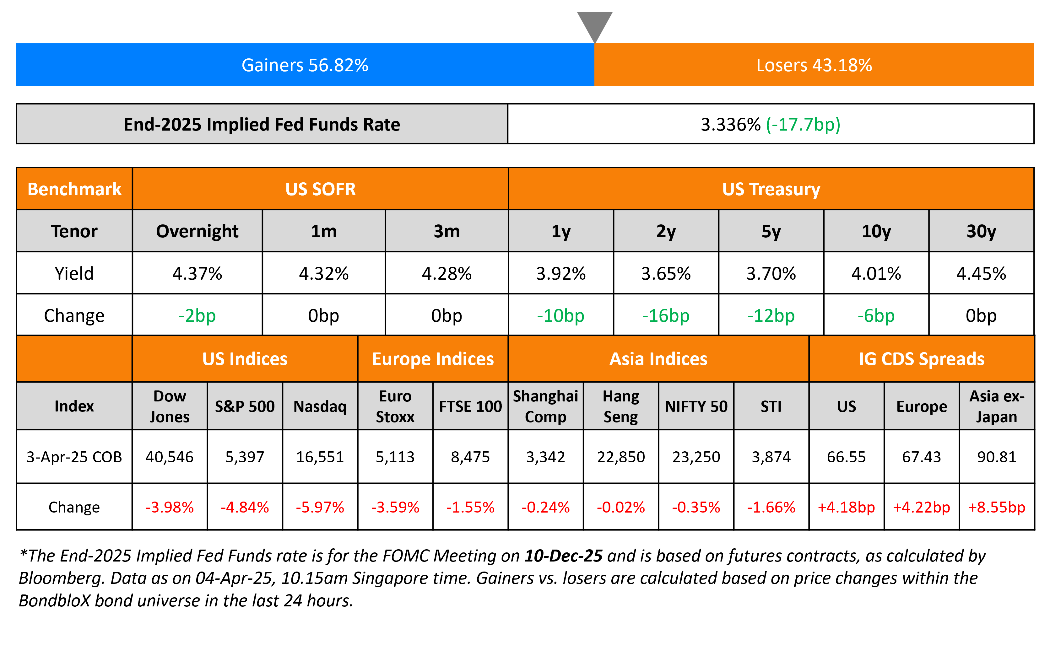 Global markets witnessed a sea of red as the risk-off sentiment led by the tariff imposition saw a bid for haven assets like US Treasuries and gold. On the back of this, US Treasury yields dropped across the curve, with the curve bull steepening – the 2Y yield fell 16bp and the 10Y fell 6bp. The ISM Services PMI for March came-in at 50.8 lower than expectations of 52.9. This was its lowest reading since June 2024, holding just above expansionary territory. Market have reacted pessimistically and are pricing-in the possibility of about 100bp in rate cuts by end-2025.