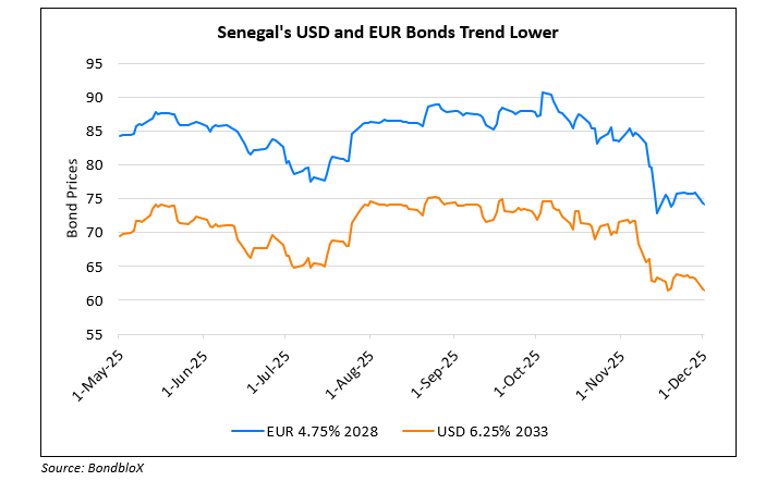 Senegal’s offshore bonds fell by ~1.5 points across the curve following comments from its Finance Minister Cheikh Diba. He said that Senegal does not fundamentally face an issue with long-term solvency, however, regarding liquidity, they would require financing assistance. He also added that talks with the IMF were progressing positively. The country’s financial stress began last year after the discovery of $7bn in hidden debt from the previous government, which led the IMF to suspend a prior $1.8bn funding package. Senegal is actively engaging with the IMF for a new facility, navigating disagreements on technical criteria and adjustment measures. The government is implementing strategies to replace “high-risk debts” with more favorable terms and is committed to fiscal discipline. Diba stated the goal is to reduce the fiscal deficit significantly from an estimated 13.4% of GDP at end-2024 to 5.3% by 2026, and further to the regional target of 3% by 2027. Importantly, the country recently ruled out talks of a debt restructuring, signaling an intent to honor its obligations to investors.