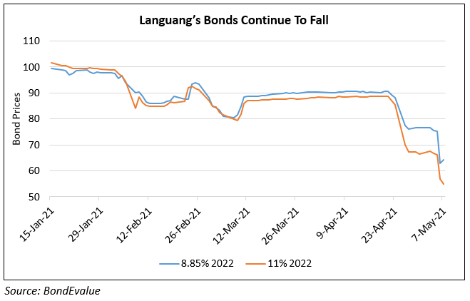 Bonds of Chinese property developer Sichuan Languang dropped further after Moody’s downgraded it to B2 citing a low liquidity buffer, especially as the company has large upcoming debt maturities in the next 12-18 months. The 11% 2022s issued by subsidiary Hejun Shenze dropped 14% on Thursday after the rating action. Bonds of the company first fell during the last week of April on liquidity concerns with Bloomberg reporting that the company has about $1bn of offshore bonds and $2bn of onshore debt outstanding and they were mulling a sale of a stake in the company and/or in some of its property projects.