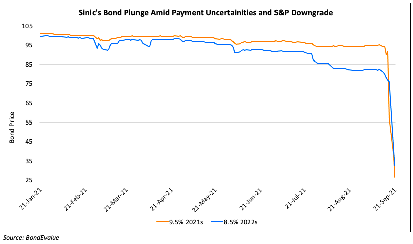 China’s Sinic Holdings has been downgraded to CCC+ from B by S&P and placed on CreditWatch Negative due to elevated payments risks on account of a lack of concrete payment plan for its $246mn 9.5% 2021s due in October despite the company having adequate sufficient unrestricted cash. The company had prepared a plan to repay its 9.5% 2021 with its cash balance of over RMB 14bn ($2.17bn) as of June 30, 2021 but the investor concerns have surfaced regarding the property developer ability to meet its obligations after its equity and debt price plunged in the last few trading days. This comes as most of Sinic’s cash could be inaccessible since it may be trapped at project levels as per the rating agency. Banks could also limit the transfer of funds to the company projects. The rating agency has also revised the company’s management and governance assessment to negative from fair due to lack of adequate risk management and public communication to stakeholders around its repayment plans. It said said, “We downgraded Sinic because the company failed to communicate a clear repayment plan.” and added, “We placed the rating on CreditWatch negative to reflect the execution risks over Sinic’s repayment plans. This is mainly due to the lack of planning and the short timespan before the repayment is due. Given the heightened yields on Sinic’s outstanding senior notes, we believe refinancing by issuing new notes will not be a feasible option.”