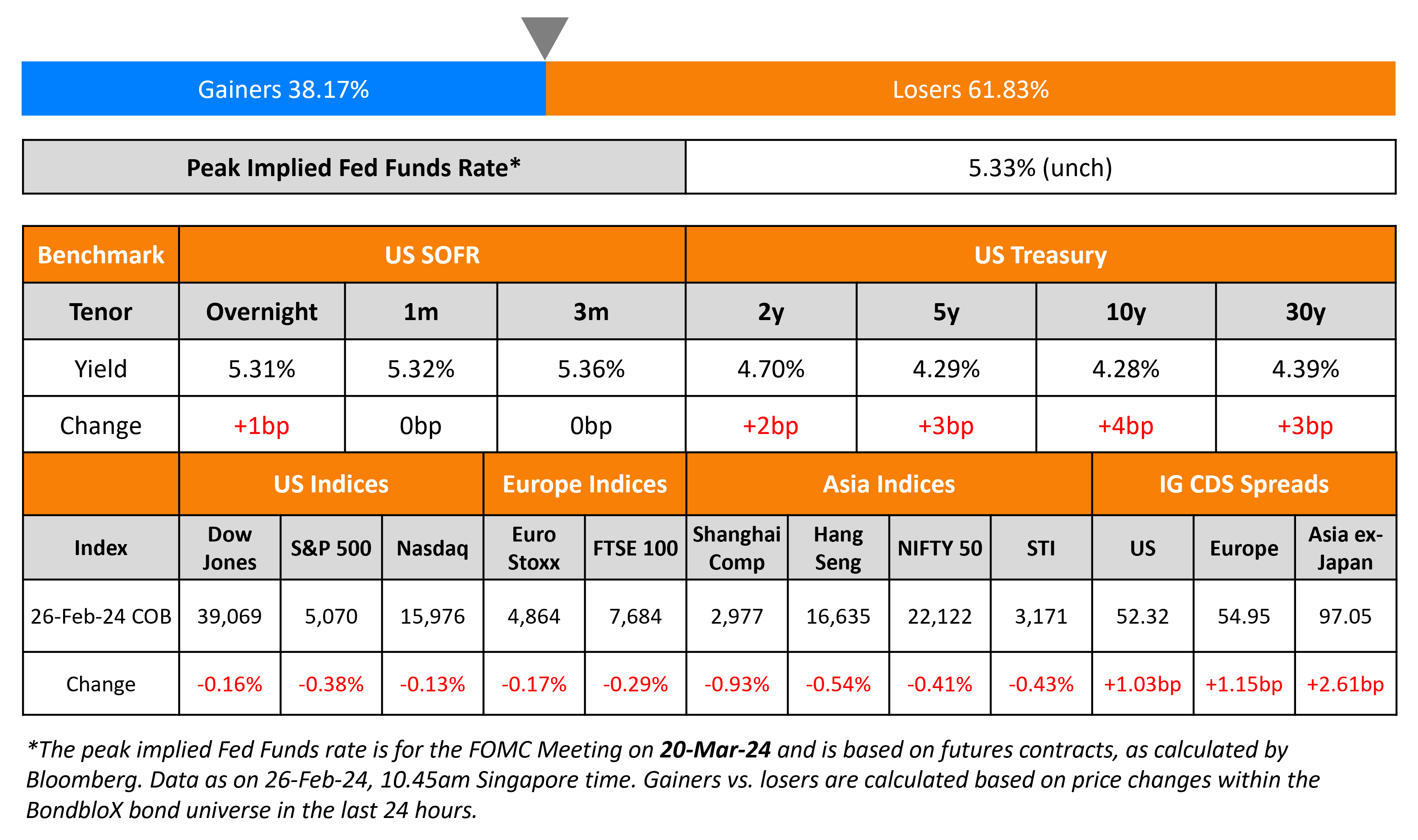 European equity markets ended slightly lower too. Credit markets in the region saw the European main CDS spreads widen by 1.2bp while crossover spreads widened by 4.2bp. Asian equity markets have opened slightly lower today. Asia ex-Japan IG CDS spreads were 2.6bp wider. Japan’s Core CPI rose 2% in January 2024, slowing from a 2.3% gain in December and posting the lowest reading since March 2022. However, this was above market forecasts of 1.8%. Japan’s core CPI print is now within the central bank’s 2% target after exceeding that level for 21 consecutive months.