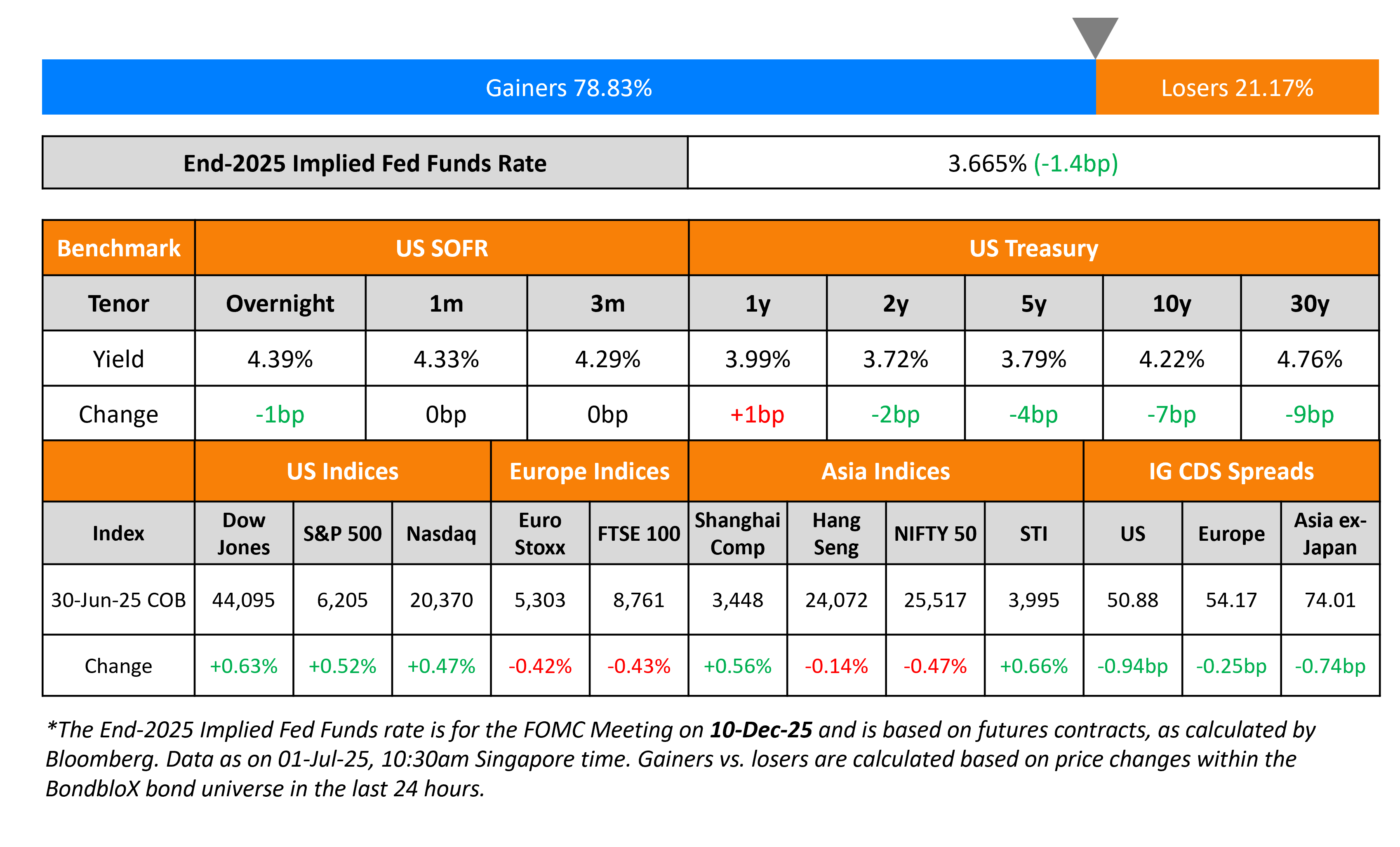 Looking at equity markets, the S&P and Nasdaq were both higher by ~0.5% each. In credit markets, US IG CDS spreads were tighter by 0.9bp and HY CDS spreads tightened 7.2bp. European equity markets ended lower. The iTraxx Main CDS spreads tightened by 0.3bp and Crossover CDS spreads tightened by 1.7bp. Asian equity markets have opened mixed today. Asia ex-Japan CDS spreads were tighter by 0.7bp. China’s Manufacturing PMI contracted for a second consecutive month, coming-in at 49.7 in June, while the Services PMI inched higher to 50.5.