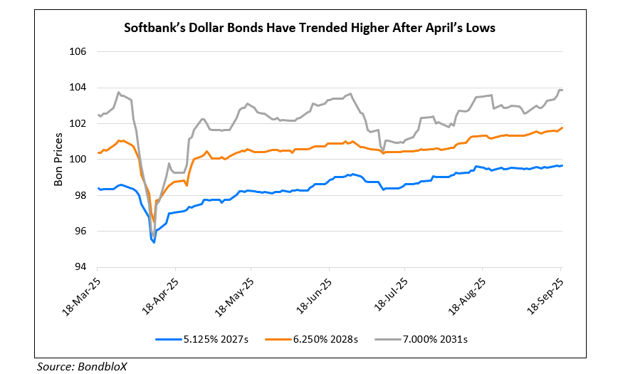 SoftBank was upgraded to Ba2 from Ba3 by Moody’s, as the rating agency cited lower leverage, reduced secured debt, and progress in asset sales. Moody’s estimates that SoftBank’s market value-based leverage has improved to ~23% as of June 2025, down from the high-30s to low-40% range previously. SoftBank has fully divested its Alibaba stake and used the proceeds to settle forward contracts. Moody’s noted that they were considering these forward contracts as debt for SoftBank earlier. Separately, SoftBank’s secured debt at the holding company level at the end of 1H2025 has reduced to 20% from 50% YoY.