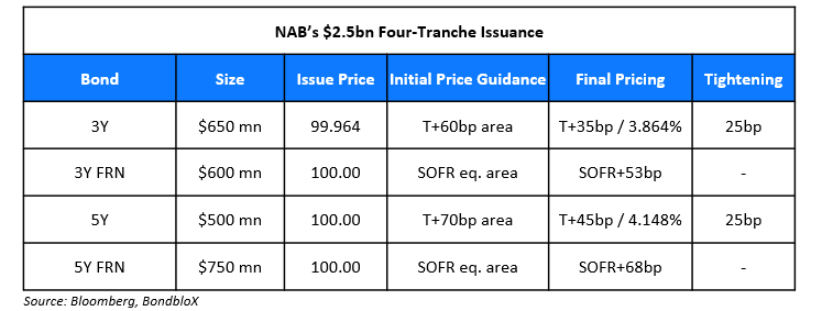 Agricultural Bank of China raised $600mn via a 5Y FRN at SOFR+45bp, 60bp inside initial guidance of SOFR+105bp area. The note is rated A1/A/A. Proceeds will be used for general corporate purposes.