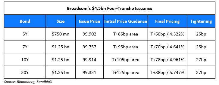 Charter Communications raised $3bn via a two-tranche offering. It raised $1.75bn via a 7NC3 bond at a yield of 7.0%, 12.5bp inside initial guidance of 7.125% area. It also raised $1.25bn via a 10NC5 bond at a yield of 7.375%, 12.5bp inside initial guidance of 7.5% area. The senior unsecured notes are rated B1/BB-/BB+. Proceeds will be used for general corporate purposes, including refinancing existing indebtedness and funding potential share buybacks.