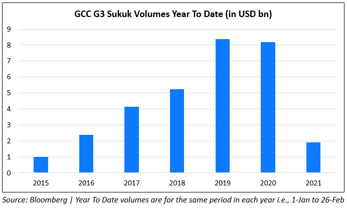 Global Sukuk issuance has slowed to multi-year lows for the year to date (YTD) period. As per Bloomberg, sovereign and corporate issuers globally have sold ~$2bn of sukuk debt this month and $4bn YTD, the lowest amount in the same period since 2015. GCC Sukuk G3 issuances are at $1.91bn YTD and just $160mn this month, the lowest since 2015. This is in stark contrast to volumes in these periods during the last three years. The sell-off in US Treasuries (leading to a rise in yields), which act as a pricing benchmark has been attributed as a major reason for the slowing down in issuances as per Akber Khan, senior director of asset management at Al Rayan Investment. He also adds that with oil prices rising this year, sovereigns which depend on the commodity have benefitted from expected deficits reducing and thereby less need to raise money via debt. Mr. Khan further added, “Banks also have plenty of liquidity so have been more focused on raising quasi-equity capital.” On a similar note, Moody’s published a report stating that 2021 global Sukuk issuances are to see a pullback after a record 2020. Moody’s forecasts overall Sukuk issuance of $96bn in 2021, down from $109bn in 2020.