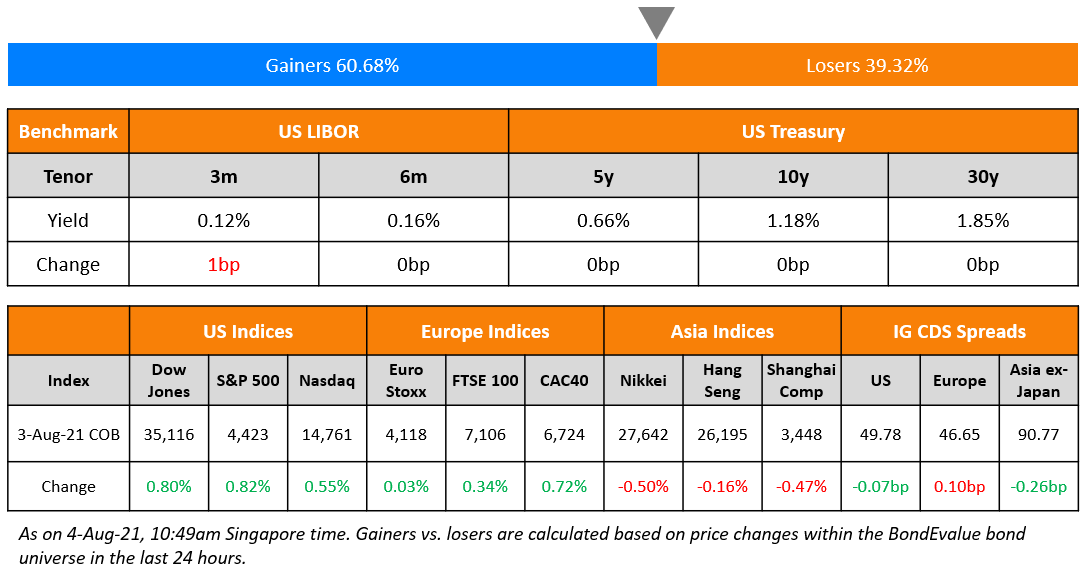 US factory orders for June grew by 1.5% vs. 2.3% in the previous month, but better than the forecasted 1%. Brazil’s industrial production for June recorded 0% vs 1.4% in the previous month and lower than the forecast of 1.7%. Eurozone PPI for June at 1.4% was in-line with forecasts and marginally better than May’s 1.3%. US IG CDS tightened 0.1bp and HY spreads tightened 0.8bp. EU Main and Crossover spreads widened 0.1bp and 0.9bp respectively. Asia ex-Japan CDS spreads were 0.3bp tighter.