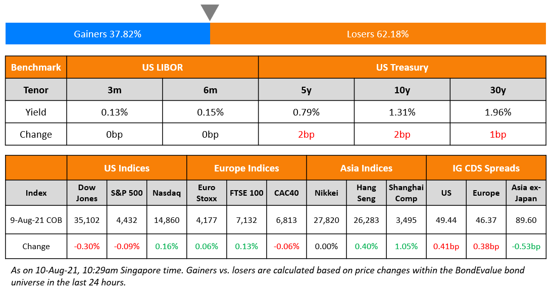 US markets closed mixed even as the number of US job openings expanded – the S&P fell 0.1% from its record while Nasdaq inched up 0.2%. Healthcare, Consumer Staples and Financials, up ~0.3% provided support to the bourses while Energy down 1.5% and Real Estate, Industrials and IT down ~0.4% dragged the indices lower. European markets continued to hover close to records – the FTSE was up 0.1% while CAC and DAX were down ~0.1%. Saudi’s TASI closed 0.2% lower while UAE’s ADX was up 1%. Brazil’s Bovespa gained 0.2%. APAC stocks had a soft start on concerns over the spread of the Delta variant – Singapore’s STI, Nikkei and HSI were 0.2-0.6% while Shanghai is down 0.2%. US 10Y Treasury yields gained 1bp to 1.31%. US IG CDS spreads widened 0.4bp and HY widened 3.3bp. EU Main CDS spreads widened 0.4bp and Crossover spreads tightened bp. Asia ex-Japan CDS spreads were 0.5bp tighter.