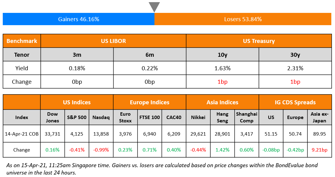 S&P and Nasdaq slipped 0.4% and 1% respectively after moving higher intra-day as the earnings season is underway with banking majors Goldman, JP Morgan and Wells Fargo reporting strong numbers. US 10Y Treasury yields were 1bp higher. Meanwhile in Europe, DAX was down 02% while CAC and FTSE were up 0.4% and 0.7% respectively. US IG CDS spreads were 0.1bp tighter and HY was 0.4bp tighter. EU main CDS spreads were 0.4bp tighter and crossover spreads tightened 2.8bp. Asian equity markets are down 0.5% and Asia ex-Japan CDS spreads were a massive 9bp wider.