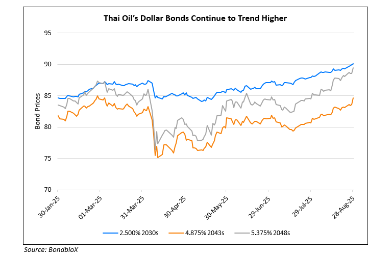 Thai Oil’s dollar bonds have trended higher since April 2025, and were up by 1-1.5 points on Wednesday. The move has been supported by improving sentiment around the company’s operations and outlook. At its annual general meeting, the management reiterated their commitment to long-term growth despite challenges in the ongoing Clean Fuel Project (CFP). CFP investment of $1.2-1.7bn will come from two major sources – cash in hand and cash flow from operations. In April, the Thai Oil announced the termination of its EPC contract with the main UJV contractor responsible for CFP delays, a move seen as critical to resolving project risks and improving execution visibility. Thai Oil has also ensured that the termination will not hamper with the CFP project completion. Thai Oil had appointed consulting firm Wood Plc as the new Energy Procurement & Construction Management (EPCM) firm in May. Sriracha Construction was granted the contract in June.