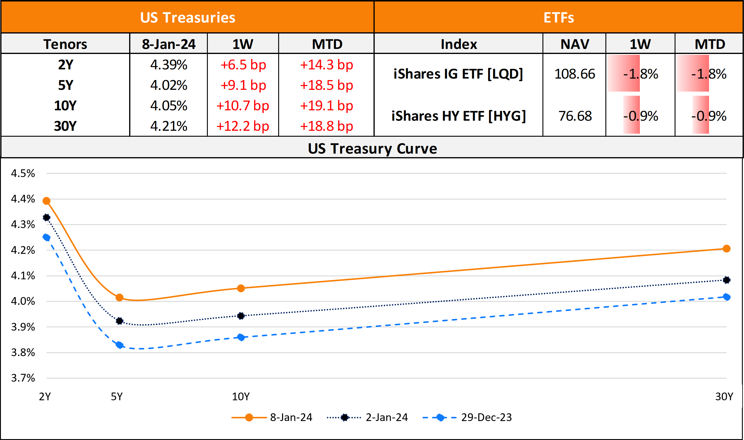 EU Corporate G3 issuances stood at a massive $67.3bn to begin the year, with banks dominating the issuance tables. The largest deal was by KfW that raised $9bn, followed by Lloyds that raised ~$4.35bn via a dual-currency issuance. Several other banks like NatWest, ING and Credit Agricole raised over $2.5bn each, while others like UBS, Lloyds, Barclays raised about $1-2bn via single or dual-currency issuances. The region saw 1 upgrade and 7 downgrades across the three major rating agencies. The GCC dollar primary bond market did not see any new deals. Across the Middle East/Africa region, there were no upgrades nor downgrades across the major rating agencies. LatAm saw $10.2bn in new deals in the first week of the new year with Mexico raising $7.5bn via a three-trancher, followed by BBVA Mexico and Bimbo Bakeries raising $900mn and $800mn each. The South American region saw no upgrades and nor downgrades across the rating agencies.