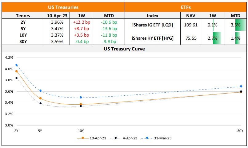 US primary markets saw $16.8bn in new deals last week as compared to $20.7bn in new deals a week prior to it. Of the deal volumes, IG issuers raised $9.65bn in new issuances led by GM Financial’s $2.25bn and Micron’s $1.5bn dual-tranchers each. HY saw $7.14bn in new deals led by Cloud Software’s $3.84bn issuance and Ford Motor’s $1.5bn deal. In North America, there were a total of 35 upgrades and 33 downgrades across the three major rating agencies last week. US IG bond funds saw $1.79bn in inflows for the week ended April 5 after $881mn was withdrawn in the week prior to it. HY funds saw $3.77bn in inflows reversing the $2.1bn in withdrawals the week before.