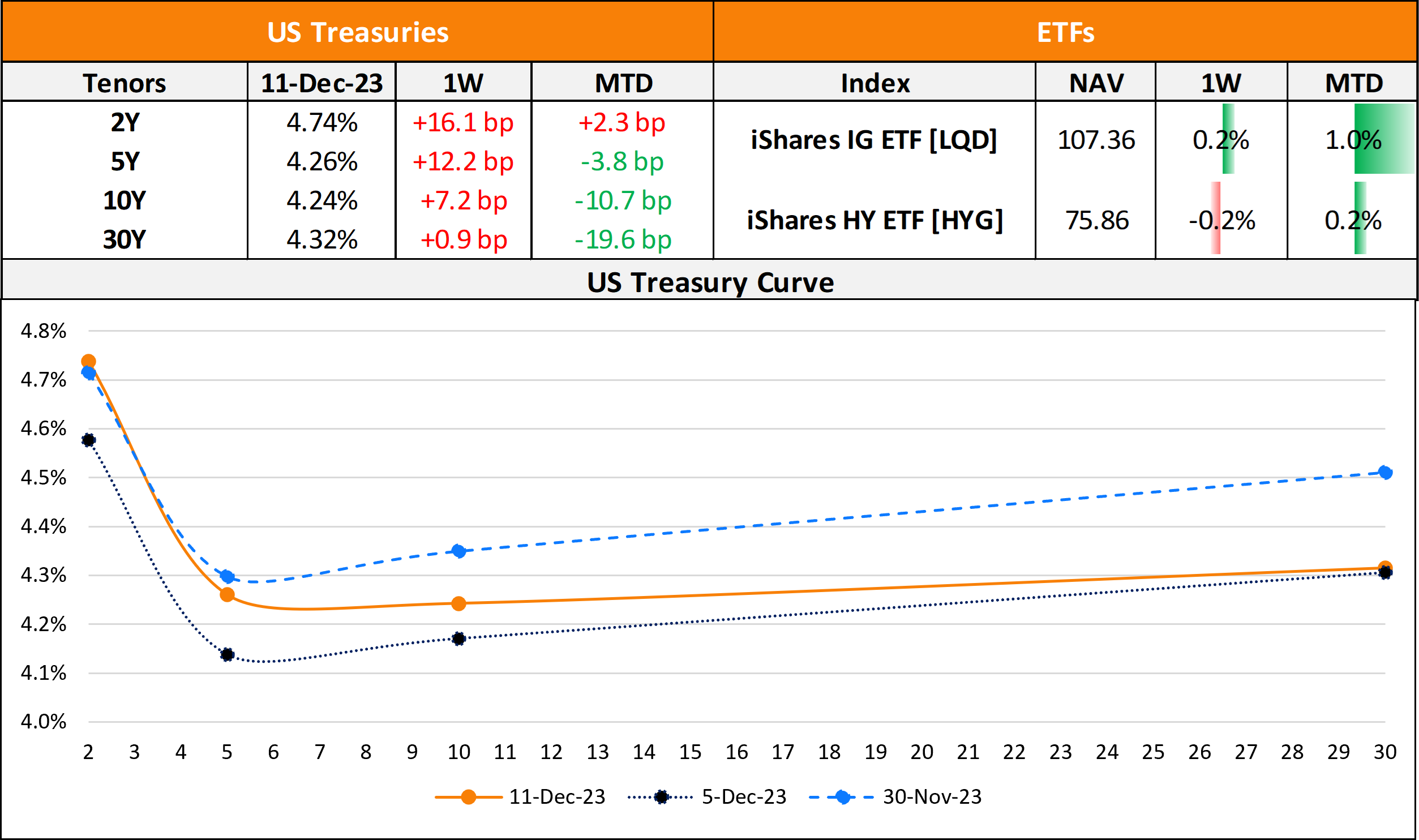 US primary market new deals jumped last week to $27.2bn vs. $11.6bn a week prior with IG issuers taking $19.2bn in deals led by JPMorgan, General Motors and Well Fargo $3.75bn, $3bn and $2.75bn via two or three-tranchers each. HY issuers saw $7.9bn in deals led by Alliant Holdings and NextEra Energy raising $750mn each followed by Univision Communications’ $700mn deals. In North America, there were a total of 28 upgrades and 77 downgrades across the three major rating agencies last week. US IG funds saw $633.33mn in inflows for the week ending December 6 after seeing $325mn in outflows a week prior to it. HY funds saw $2.05bn in inflows last week, adding to the $296bn seen a week earlier to it.