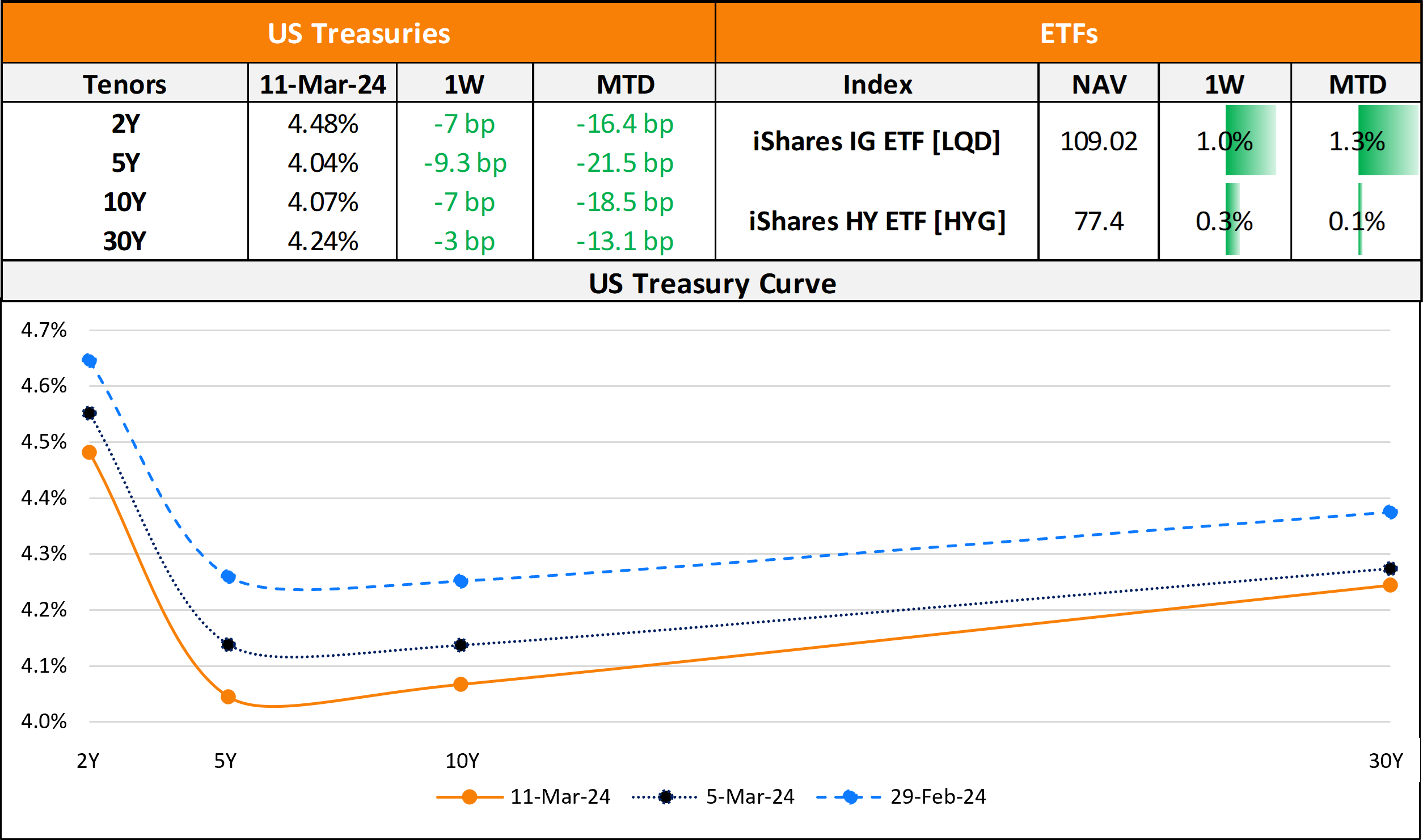 US primary markets continued to stay active, with new deals at $45.9bn vs. $38.1bn seen a week before this. IG issuers racked up $36.7bn in deals with JPMorgan’s $2.5bn deal and Ford Motors’ $2.5bn dual-trancher leading the tables. HY issuers accounted for $8.1bn of the volume with United Rental’s $1.5bn deal and USA Compression Partners’ $1bn deals leading the tables. In North America, there were a total of 34 upgrades and 32 downgrades across the three major rating agencies last week. US IG funds saw $4.2bn in inflows for the week ending March 6, adding to the $1.96bn in inflows seen in the week before this. HY funds saw inflows of $347mn during the same period, reversing outflows of $448.8mn seen a week prior.