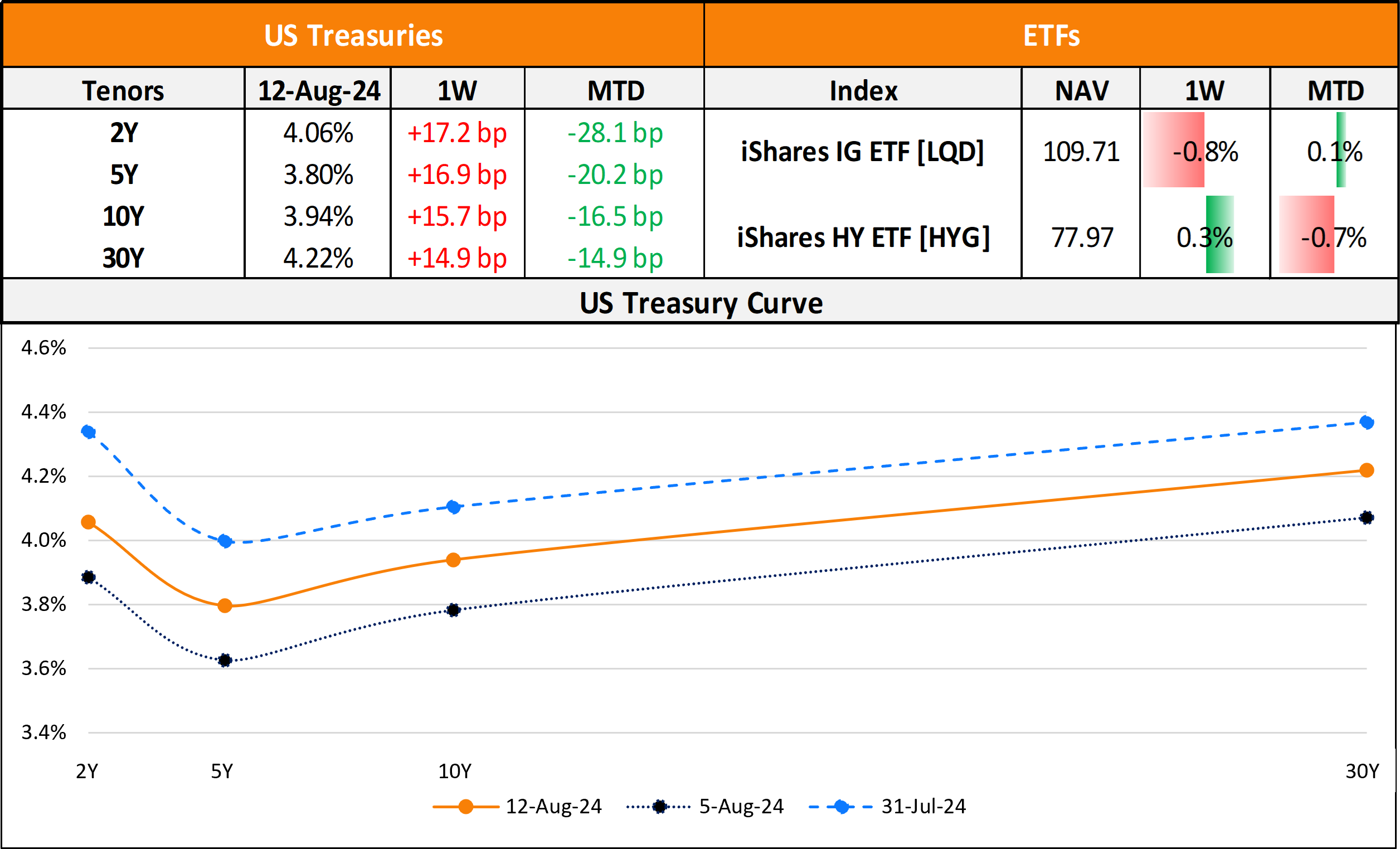 US primary market issuances stood at $43.5bn last week vs. $35.9bn in the week prior to it. IG issuers took up $37.5bn of the total, led by Meta’s $10.5bn five-part deal and Coca Cola’s $3bn three-tranche deal. HY issuers accounted for $5.9bn of the volume with Lightning Power’s $1.5bn deal and Post Holdings’ $1.2bn deals each leading the tables. In North America, there were a total of 31 upgrades and 24 downgrades across the three major rating agencies last week. US IG funds saw $1.71bn of inflows for the week ending August 7, adding to inflows of $1.79bn in the week prior to it. HY funds saw $1.2bn in outflows, reversing the $1.92bn inflows seen in the two consecutive weeks before this.