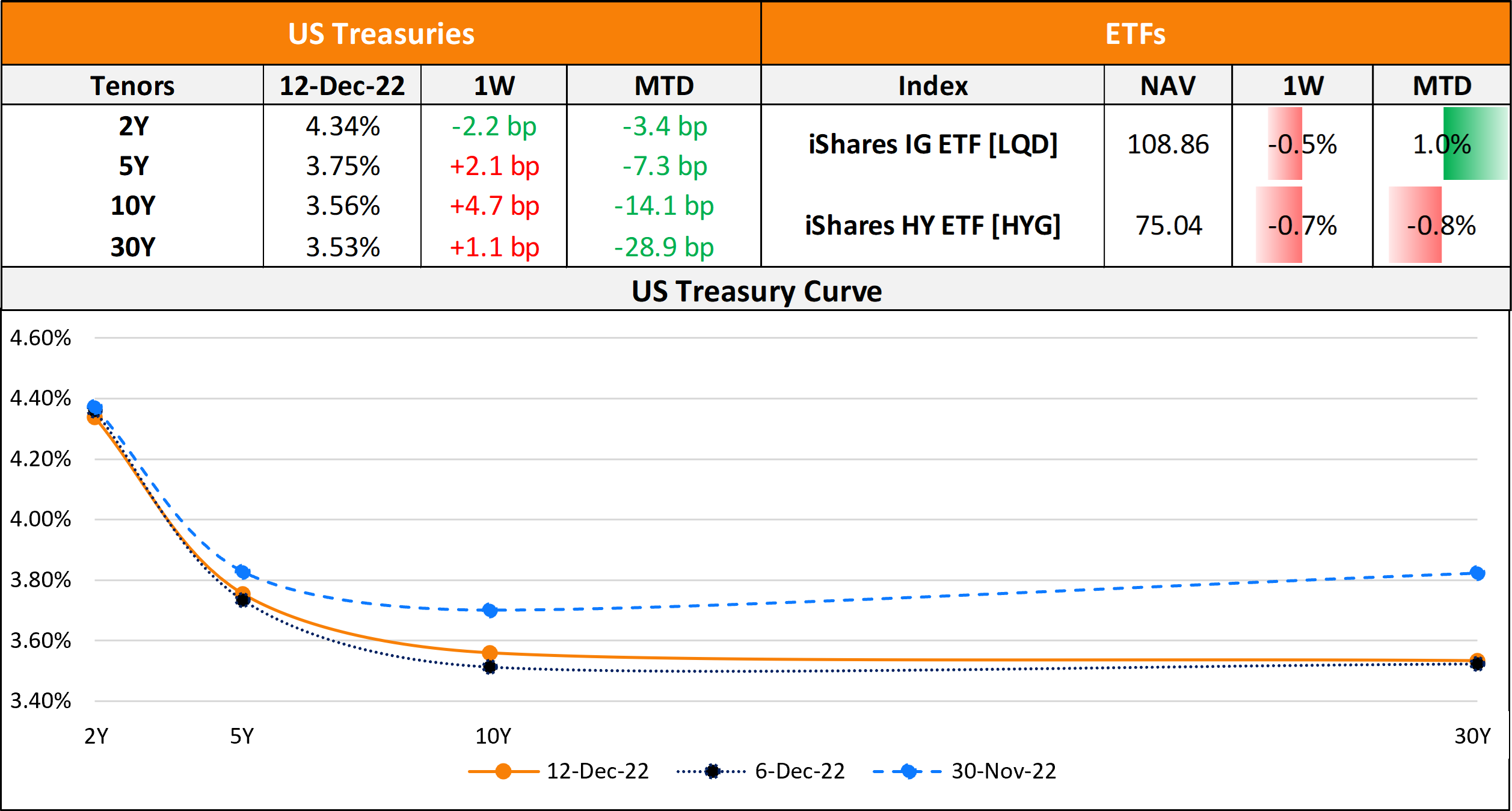 Issuance volumes dropped across all regions last week. US primary market issuances dropped last week to $9.3bn vs. $17.7bn in the week prior to it. IG issuances stood at $6.8bn led by Energy Transfer’s $2.5bn and Duke Energy’s $1bn two-tranchers each. HY issuances stood at $2.7bn led by Chart Industries’ $1.97bn two-trancher and Brazos’ $700mn three-trancher. In North America, there were a total of 24 upgrades and 31 downgrades across the three major rating agencies last week. As per Lipper data, US IG funds saw $1.2bn in inflows in the week ended December 7, marking an end to fifteen straight weeks of outflows while HY funds saw only $66mn in inflows, breaking a run of five straight weeks of inflows. The total amount of cash pulled from IG funds during its loss streak was $47.7bn in total. LatAm saw no new deals last week as compared to $1.6bn in the week prior. In South America, there were no upgrades and nor downgrades across the major rating agencies. EU Corporate G3 issuance stood at only $8.5bn vs. $19.7bn a week prior with Landesbank Hessen’s €1.53bn five-trancher and Credit Agricole’s €500mn dual-trancher. Across the European region, there were 16 upgrades and 47 downgrades. The GCC G3 primary bond market saw no new deals vs. $355mn in deals in the prior week. Across the Middle East/Africa region, there were 3 upgrades and 10 downgrades each across the three major rating agencies. APAC ex-Japan G3 issuances were at a meagre $1.44bn vs. $5.8bn in the week prior led by China EXIM’s $340mn issuance followed by ICBC Macau and TFI Overseas’ $250mn deals each . In the APAC region, there were 6 upgrades and 7 downgrades combined across the three rating agencies last week.