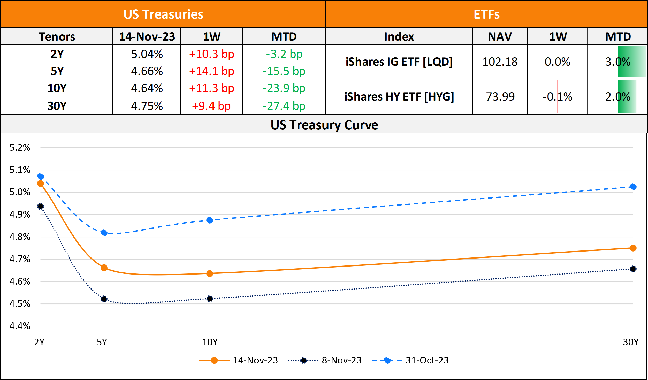 US primary market new deals jumped higher last week to $33.7bn vs. $25.7bn a week prior with IG deals at $23.8bn led by RTX’s $6bn five-trancher and Roche Holdings raising $4.4bn four-tranchers respectively. HY issuances stood at $4.9bn with SRM Concrete’s and Service Properties Trust raising $1.1bn and $1bn each. In North America, there were a total of 27 upgrades and 55 downgrades across the three major rating agencies last week. US IG bond funds saw outflows of $1.5bn, adding to outflows of $2.76bn for the week ended November 8. For the same period, HY funds saw inflows of $6.3bn, reversing $953mn in outflows seen in the week prior. Some investment managers have noted that buying high yield bonds could be the top contrarian trade in 2024 as default rates peak and rates ease (scroll to Talking Heads for more details).