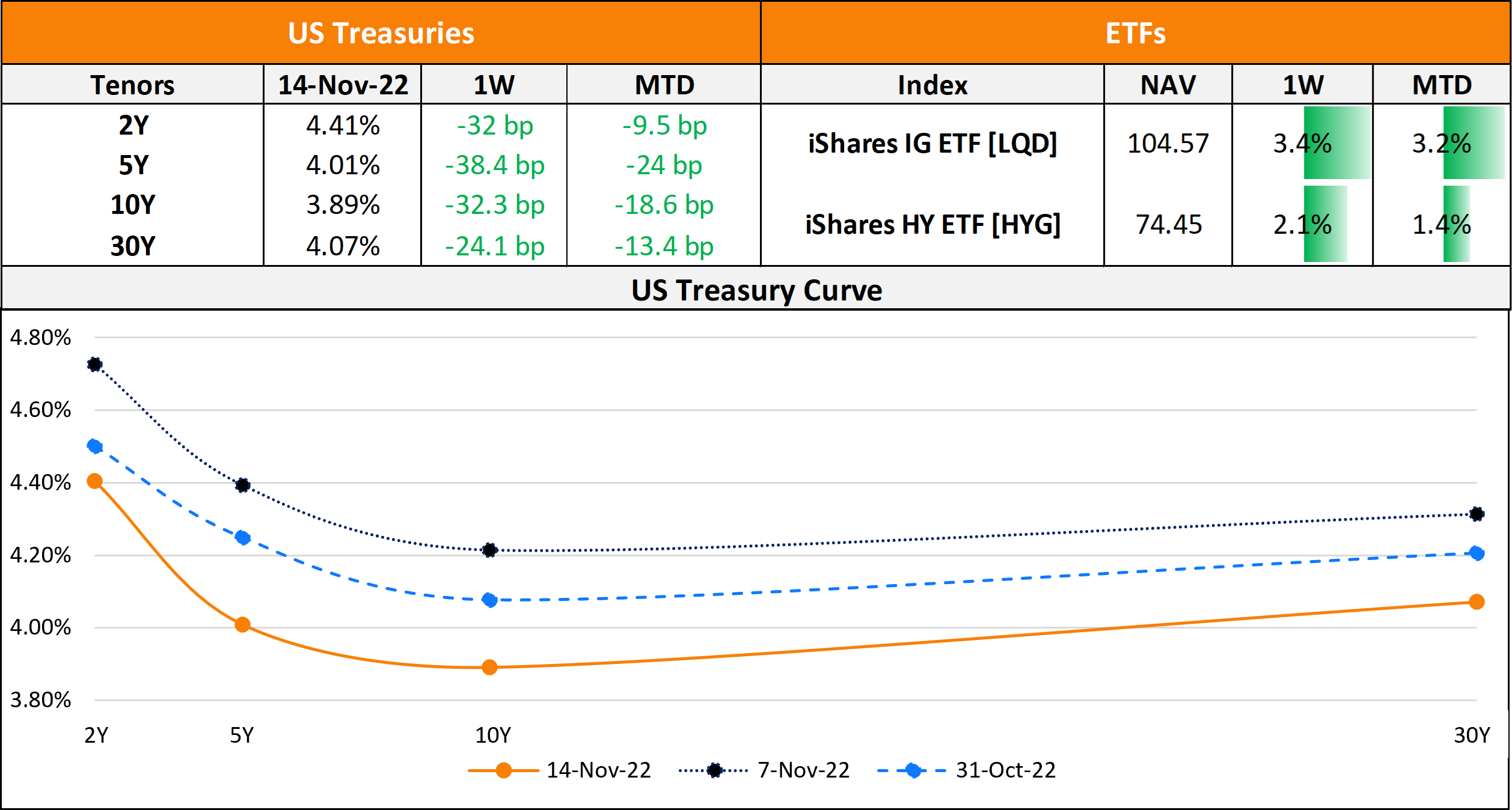 The US yield curve saw a sharp downward shift across tenors late last week after a softer than expected inflation print – US CPI came in at 7.7% for October, lower than expectations of 7.9%. Core CPI came at 6.3%, also lower than expectations of 6.5%. The 2Y, 5Y and 10Y yields dropped over 30bp last week causing a rally across the bond market, particularly IG bonds that saw its largest 1-Day gain in over 30 years. US primary market issuances saw a sharp increase in deals to $39.5bn vs. $11.4bn in the week prior. IG issuances stood at $33.7bn led by GE Healthcare’s $8.25bn six-trancher, Oracle’s $7bn four-trancher and Citi’s $2.75bn deal. HY issuances stood at $6.3bn led by DISH Network’s $2bn issuance and Nielsen’s $1.96bn deal. In North America, there were a total of 15 upgrades and 60 downgrades across the three major rating agencies last week. As per Lipper data, US IG funds saw $1.74bn in outflows in the week ended November 9, a twelfth straight week of outflows while HY funds saw $1.26bn in inflows, a third straight week of inflows. In fact, collective daily flows into two of the largest HY ETFs – HYG and JNK – hit a record high of over $2.15bn. HYG pulled in $1.15bn, the highest since March and sixth highest on record while JNK received over $1bn, its highest ever. LatAm saw $691mn in new deals after two consecutive weeks of no issuances with Yara International raising $600mn. In South America, there were no upgrade and 7 downgrades across the major rating agencies. EU Corporate G3 issuance rose sharply to $41.1bn vs. $8bn a week prior with banking majors dominating the tables – Credit Suisse raised $5bn via a multicurrency issuance followed by Deutsche Bank, SocGen, ING Groep and HSBC raising €1.25bn each. Across the European region, there were 39 upgrades and 14 downgrades. The GCC G3 primary bond market saw $210mn in deals vs. no issuance in the prior week led by SNB’s $150mn issuance. Across the Middle East/Africa region, there were 10 upgrades and downgrades each across the three major rating agencies. APAC ex-Japan G3 issuances were at $5.2bn vs. $450mn in the week prior – Westpac’s $2.5bn two-trancher, ANZ’s $2bn issuance and Jinan Hi-Tech International’s $200mn deals led the tables. In the APAC region, there were 2 upgrades and 13 downgrades combined across the three rating agencies last week.