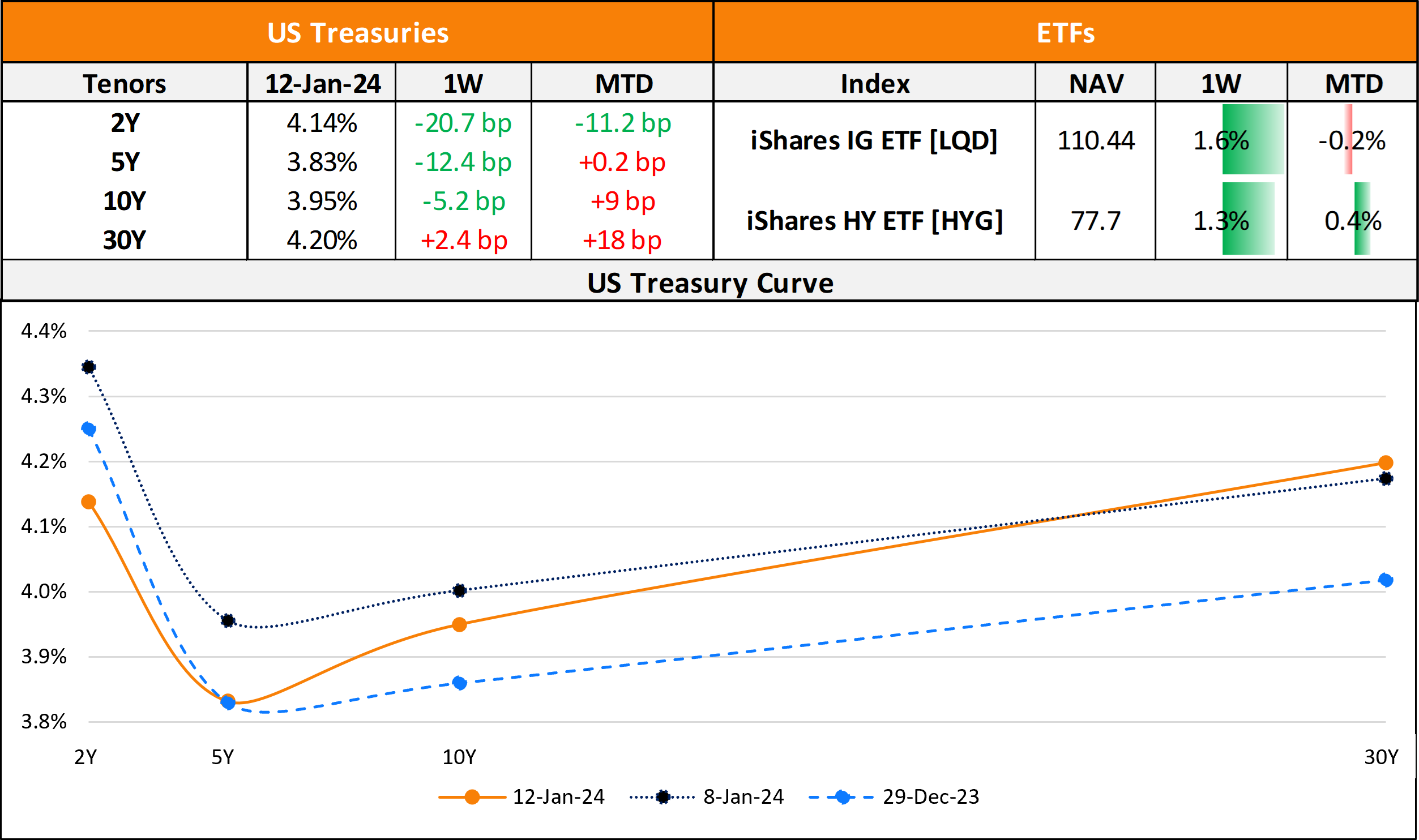US primary markets continued to stay busy, with $27.9bn in new deals last week vs. $34.4bn a week prior to that. IG issuers racked up $23.7bn in deals led by Energy Transfer and T-Mobile’s $3bn three-part issuances each. HY issuers accounted for $4.2bn of the volume with Hilton raising $900mn and Alliant’s $700mn deal. In North America, there were a total of 29 upgrades and 18 downgrades across the three major rating agencies last week. US IG funds saw $838mn in inflows for the week ending January 10, adding to the $1.64bn seen a week before that. HY funds saw $523mn in inflows as compared to $438mn in outflows during the same period.