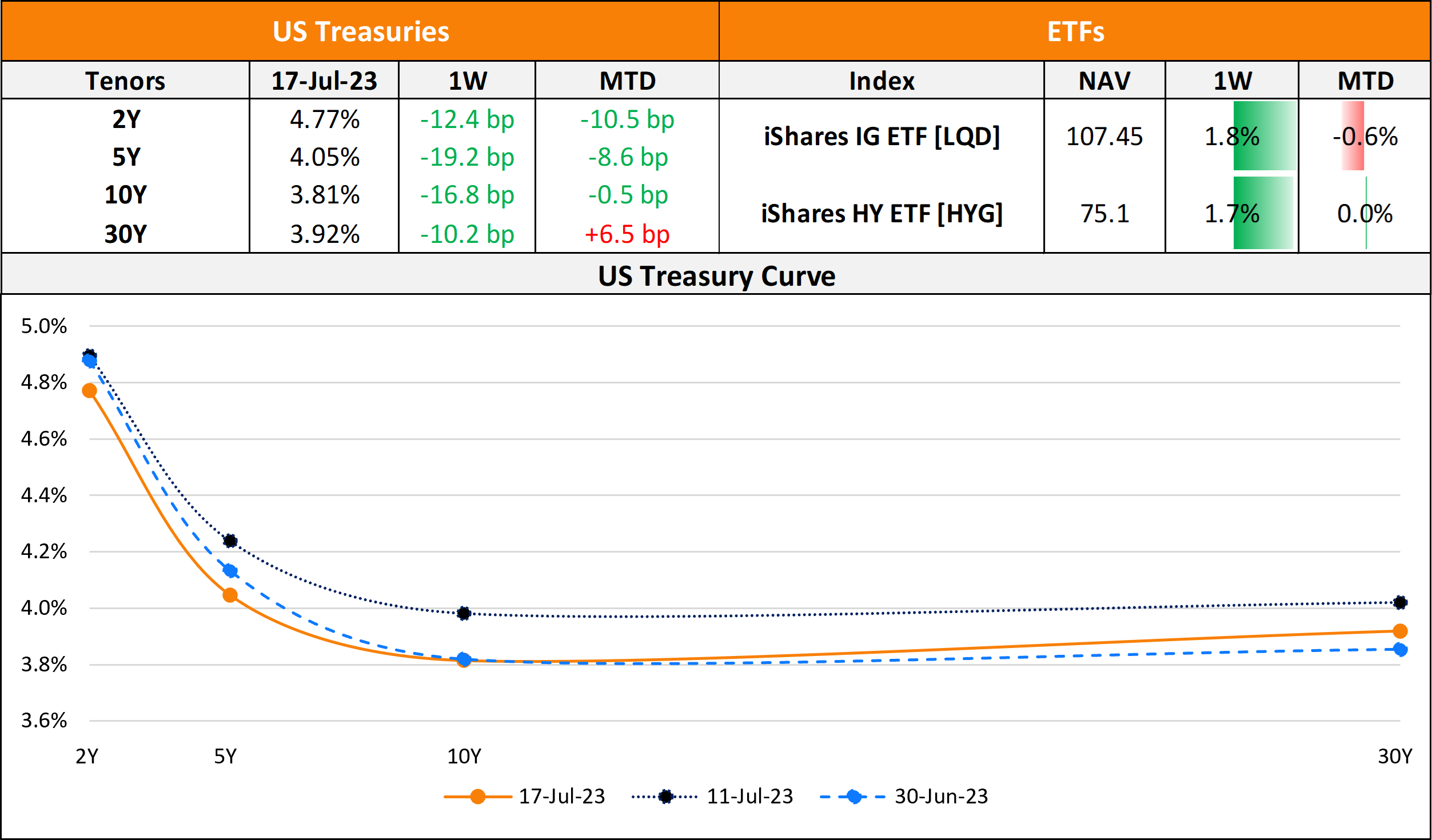 US primary markets saw an increase in new deals last week, albeit at a relatively low volume to $5.2bn vs. $2.7bn a week prior. IG deals took the majority of volumes with $4.75bn in deals led by John Deere’s $1.5bn and MetLife’s $1bn issuances. The remainder was taken by unrated issuers. In North America, there were a total of 34 upgrades and 30 downgrades across the three major rating agencies last week. US IG bond funds saw $691mn in inflows for the week ended July 12, adding to the $1.6bn in inflows during the week prior. For the same period, HY funds saw $379mn in outflows, adding to the $283.4mn in outflows seen in the week prior. Separately, Bloomberg notes that high-yield ETFs alone have lost nearly 10% of their total AUM, this year while money market funds have seen a 9% increase indicating cash allocation in safe assets. High yield funds have overall lost over 2% of their AUM while IG funds on other hand have seen a 2% rise in AUM.