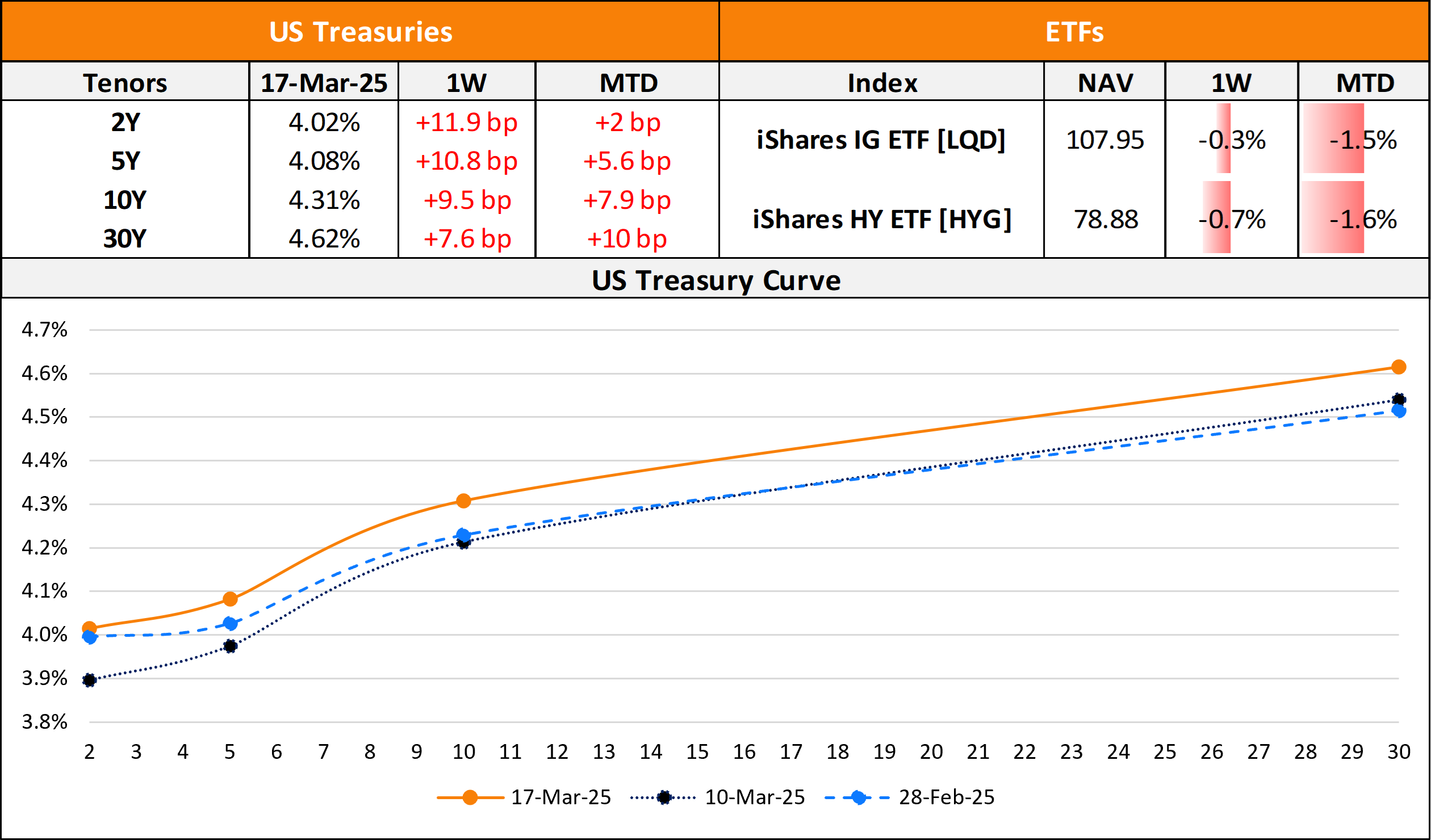 US primary market issuances dropped by nearly a third to $24bn vs. $71.1bn in the previous week. IG issuers took up $19.4bn of the total, led by Amcor Flexibles’ $2.25bn three-trancher, followed by Stellantis’ $1.75bn two-trancher. HY issuances stood at $5.9bn with Spirit Loyalty’s $840mn issuance and PBF Holdings’ $800mn deal leading the tables. In North America, there were a total of 33 upgrades and 36 downgrades each, across the three major rating agencies last week. US IG funds saw $942mn in inflows during the week ended March 12, adding to the $2.6bn inflows seen during the week before that. US HY funds saw $569mn in outflows during the same period, reversing the $1.8bn in inflows seen during the week before that.