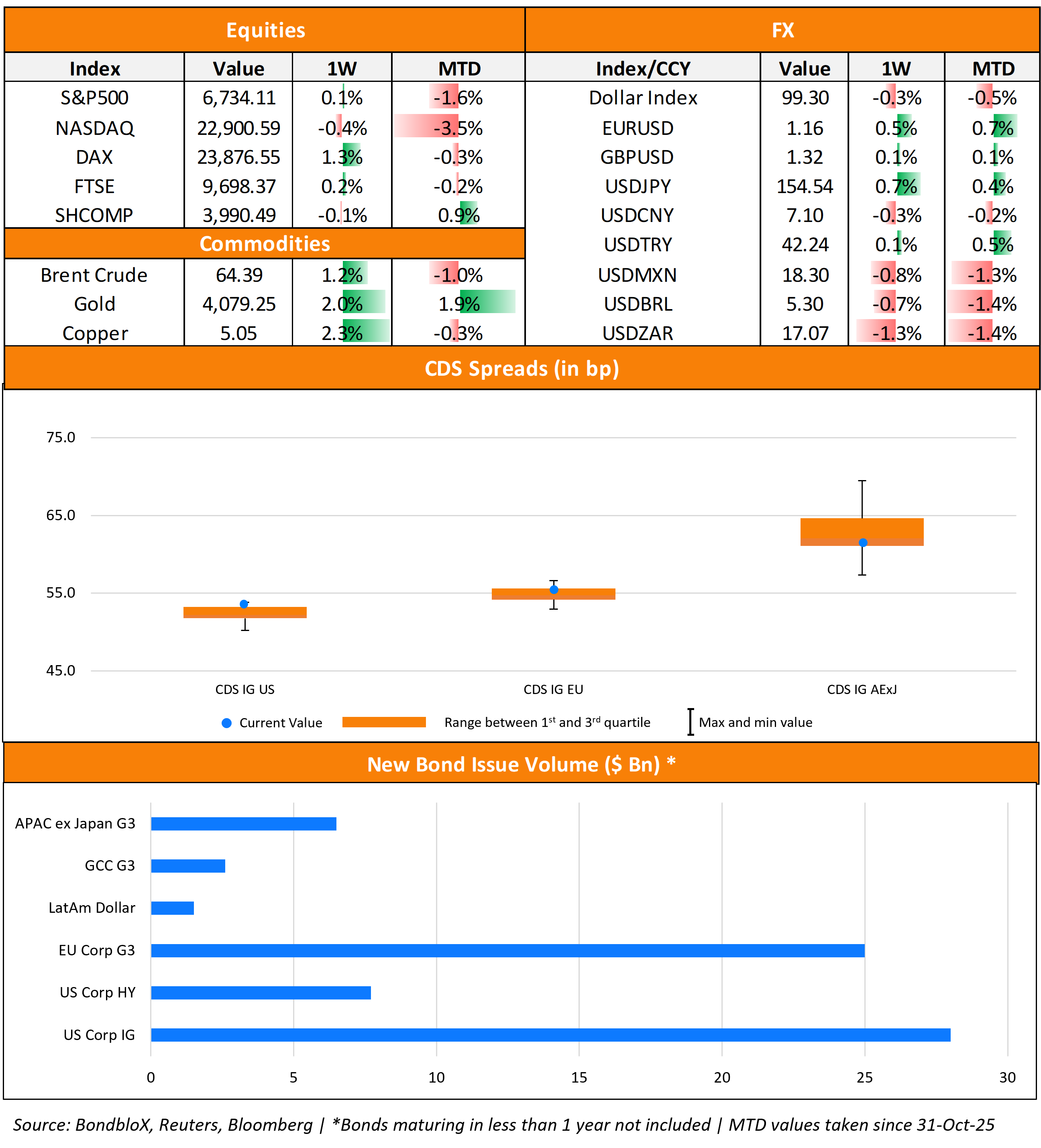 EU Corporate G3 issuances fell to $25bn vs. $37.9bn in the prior week, with volumes led by Novo Nordisk’s €4bn six-trancher, L’oreal’s €3bn three-trancher. The region saw 18 upgrades and 33 downgrades across the three major rating agencies. Last week, the GCC dollar primary bond market saw $2.6bn in new deals vs. $7.2bn in deals seen a week before that. This was led by DIB’s $1bn issuance, followed by Bank of Shajah and MAF’s $500mn issuances each. In the Middle East/Africa region, there were 11 upgrades and 5 downgrades across the major rating agencies. LatAm saw $1.5bn in new issuances last week. This was led by Cia de Inversiones de Energia and Pluspetrol’s $500mn issuances each. The South American region saw 6 upgrades and 3 downgrades each, across the three major rating agencies last week.