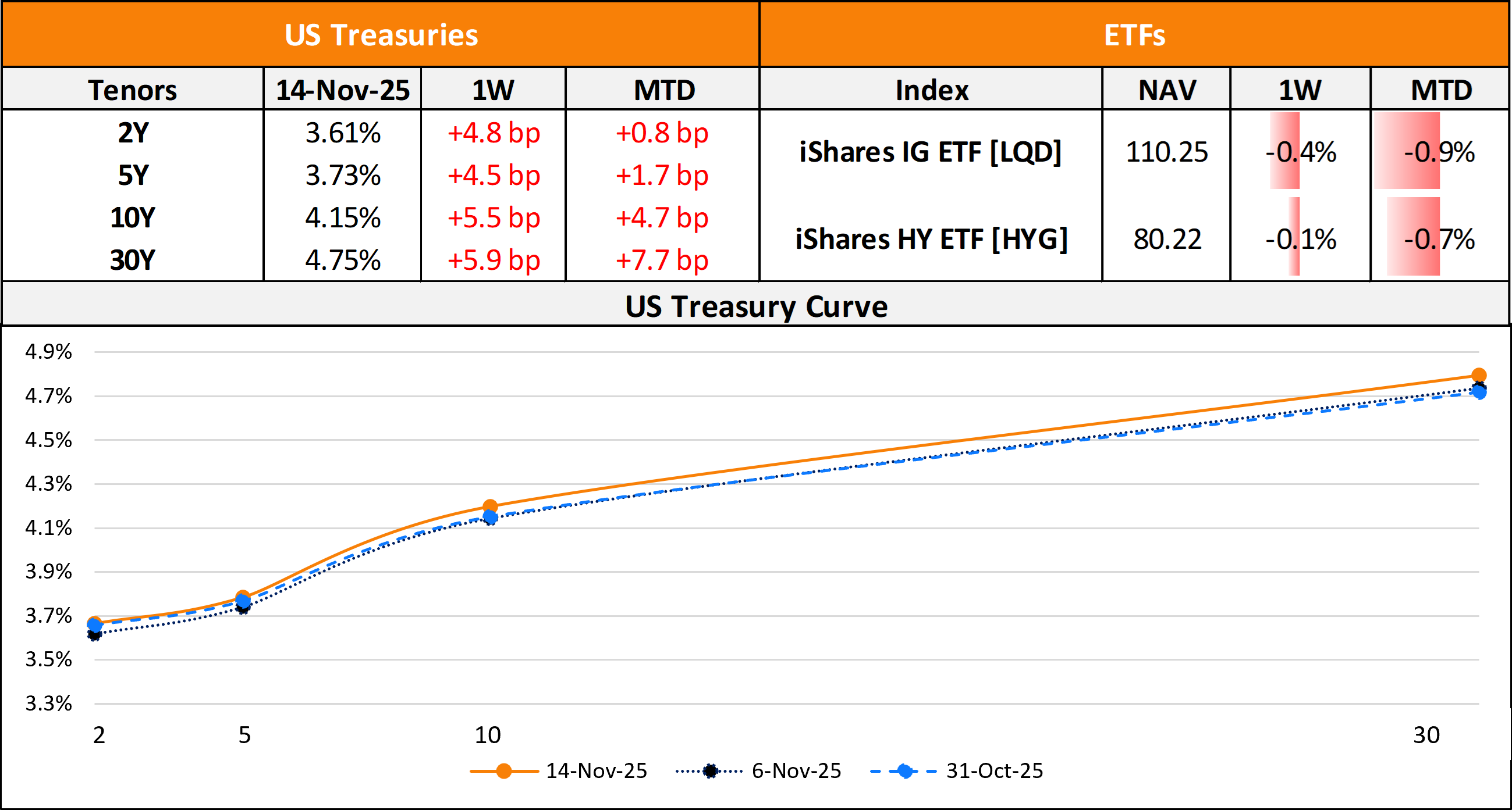 US primary market issuances eased last week to $35.9bn vs. $61.4bn in new deals seen a week prior to it. IG issuers took up $28bn of the total, led by Verizon’s $11bn five-part deal, followed by Charles Schwab’s $2bn two-part issuance. HY deals stood at $7.7bn, led by Applied Digital’s $2.35bn issuance and Commercial Metals’ $2bn two-tranche issuance. In North America, there were a total of 30 upgrades and 34 downgrades, across the three major rating agencies last week. US IG funds saw $2.1bn in inflows during the week ended November 12, adding to the $3.1bn inflows seen during the week before that. US HY bond funds saw $367mn in outflows, adding to the $956mn outflows seen in the prior week.