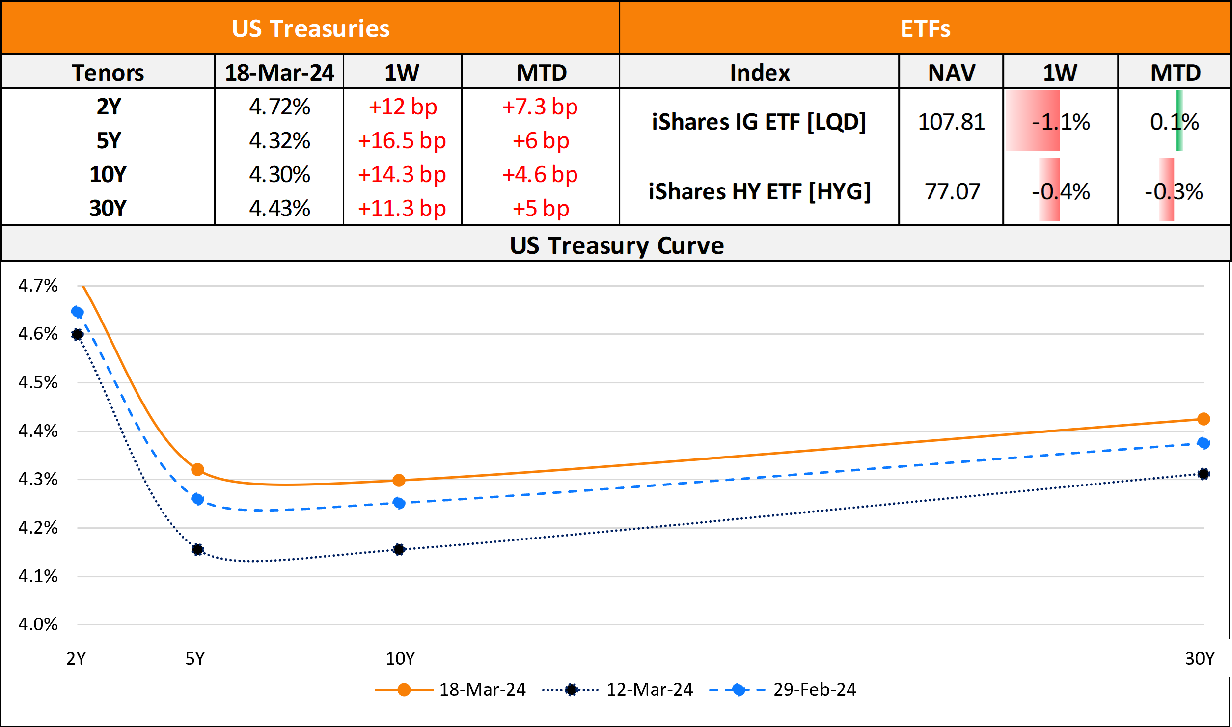 US primary markets continued to stay active, albeit with new deals dropping to $24.8bn vs. $45.9bn seen a week before this. IG issuers racked up $22bn in deals with Goldman Sachs’ $3bn two-part deal and Hyundai Capital America’s $1.7bn three-trancher leading the tables. HY issuers accounted for $2.7bn of the volume with Vital Energy’s $800mn deal and Starwood Property’s $500mn deals leading the tables. In North America, there were a total of 37 upgrades and 47 downgrades across the three major rating agencies last week. US IG funds saw $1.6bn in inflows for the week ending March 13, adding to the $4.2bn in inflows seen in the week before this. HY funds saw inflows of $289mn during the same period, adding to the inflows of $347mn seen a week prior.