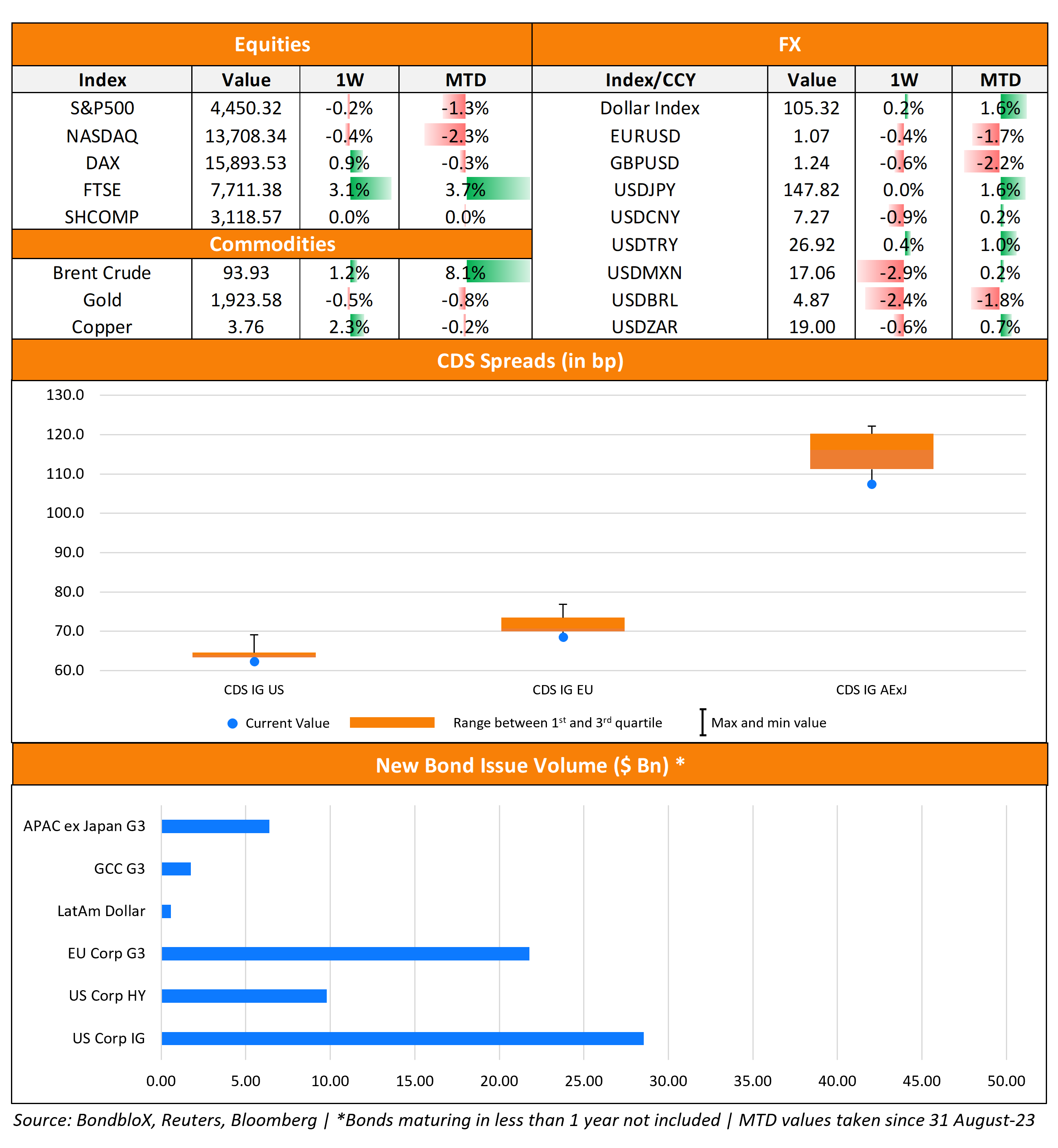 EU Corporate G3 issuances more than halved to $21.5bn vs. $47.5bn a week prior. Issuance volumes were led by KBC Group’s $2bn two-trancher, ABN AMRO’s $1.25bn deal and BBVA’s $1bn issuance. The region saw 34 upgrades and 16 downgrades across the three major rating agencies. The GCC dollar primary bond market saw $1.75bn in new deals after $2.2bn in deals a week prior. Issuances were led by Energy Development Oman (EDO) $1bn and Sharjah’s $750mn deal. Across the Middle East/Africa region, there was 1 upgrade and no downgrade across the major rating agencies. LatAm saw $565mn in new deals after $3.75bn in deals a week ago. Deal volumes were led by Hunt Oil’s $435mn deal and Minerva’s $100mn issuance. The South American region saw 1 upgrade and no downgrades across the rating agencies.