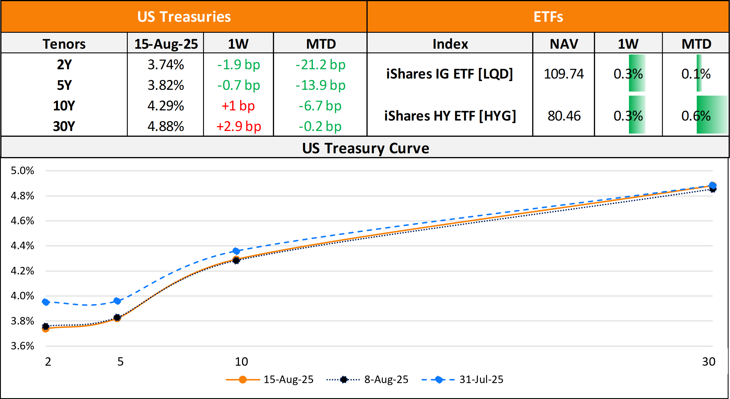 US primary market issuances fell to $39.2bn vs. $49.9bn in the prior week. IG issuers took up $31bn of the total, led by Chevron’s $5.5bn seven-trancher and CVS’s $4bn four-part issuance. HY issuances stood at $8.1bn, led by TransDigm’s $5bn four-part deal and Novelis’ $1.5bn two-tranche issuance. In North America, there were a total of 32 upgrades and 41 downgrades, across the three major rating agencies last week. US IG funds saw $2.5bn in inflows during the week ended August 13, adding to the $3.6bn inflows seen during the week before that. US HY bond funds saw $138mn in inflows, adding to the $1.6bn inflows in the prior week. Credit spreads, as measured by the CDS spreads, across all regions are at their lowest levels seen in the last month.