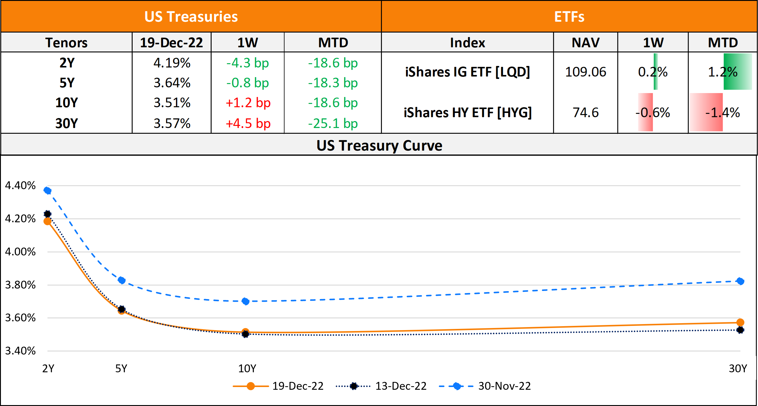 US primary market issuances dropped further last week to $3bn vs. $9.3bn in the week prior to it with JPMorgan raising the entire amount via 3Y issuance. In North America, there were a total of 16 upgrades and 24 downgrades across the three major rating agencies last week. As per Lipper data, US IG funds saw $176.9mn in inflows in the week ended December 14, a second week of inflows after having seen fifteen straight weeks of outflows while HY funds saw only $312.8mn in outflows. LatAm saw no new deals for a second consecutive week. In South America, there were 2 upgrades and 12 downgrades across the major rating agencies. EU Corporate G3 issuance stood at only $5.1bn vs. $8.5bn a week prior with Landesbank Hessen’s €2.32bn across three separate bond issuances in the week followed by Banco Sabadell’s €500mn deal. Across the European region, there were 16 upgrades and 36 downgrades. The GCC G3 primary bond market saw no new deals for a second straight week. Across the Middle East/Africa region, there was 1 upgrade and 12 downgrades each across the three major rating agencies. APAC ex-Japan G3 issuances were at only $472mn vs. $1.44bn in the week prior with CNCB HK raising $270mn and Jiangyin State-owned Assets Holding raising €100mn to lead the tables. In the APAC region, there were 11 upgrades and 8 downgrades combined across the three rating agencies last week.