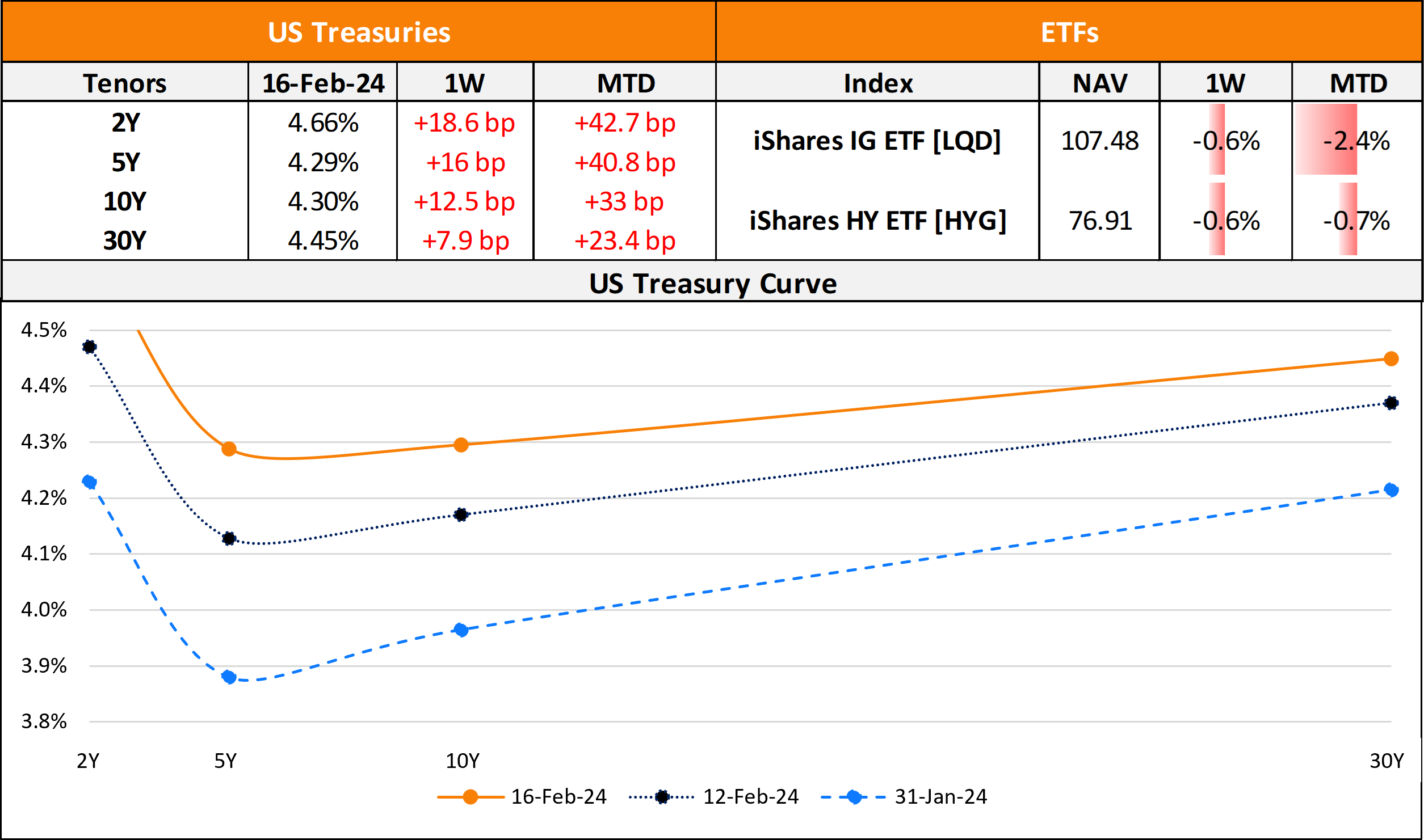 US primary markets continued to stay active, with new deals at $37.7bn vs. $41.2bn seen a week before this. IG issuers racked up $30bn in deals led by Bristol Myers’ $13bn nine-part debt deal and American Express’ $2bn two-part deal. HY issuers accounted for $7.7bn of the volume with TransDigm’s $4.4bn two-part deal and AmWINS Group’s $750mn issuance leading the tables. In North America, there were a total of 46 upgrades and 27 downgrades across the three major rating agencies last week. US IG funds saw $2.3bn in inflows for the week ending February 14, adding to the $2.8bn seen a week before that. HY funds saw $89mn in outflows during the same period, reversing the $549mn in inflows seen a week prior. 5Y CDS spreads in the US and EU are at is tightest levels in the month, standing at 52-55bp.
