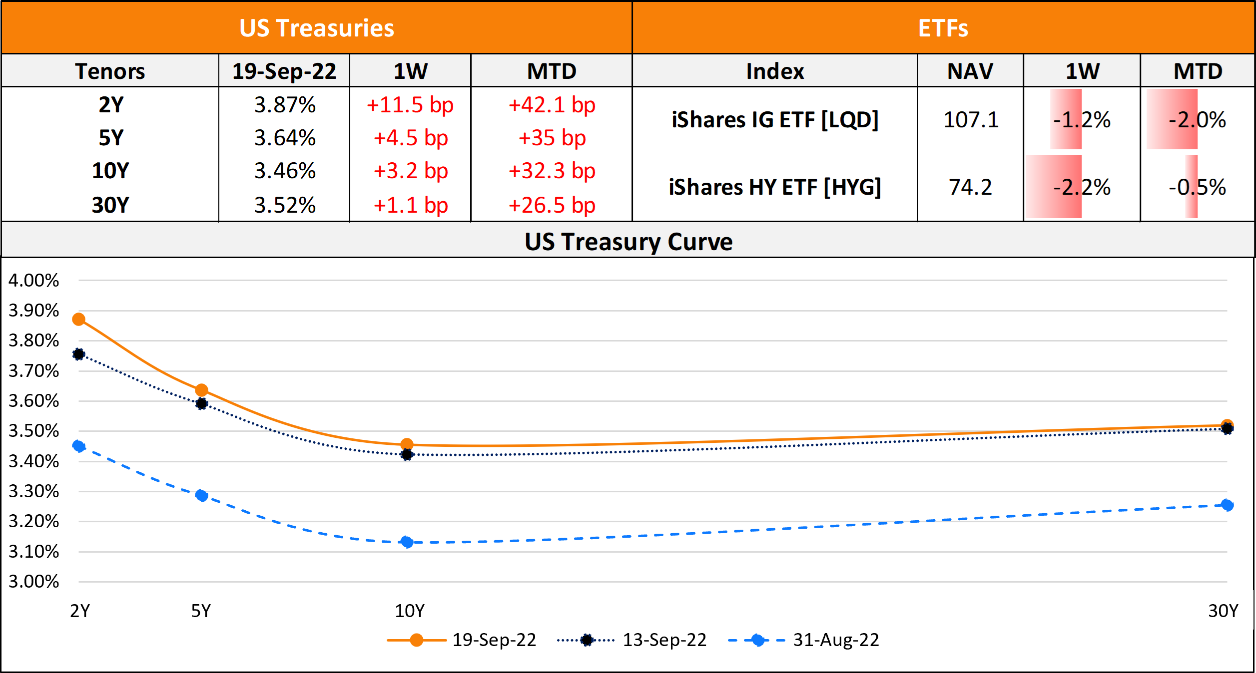 US primary market issuances saw a drop in deal volumes to $14.5bn vs. $38.8bn last week as rising rates amid persistent US inflation weighed on markets. This caused an increase in volatility with markets pricing in a more hawkish Fed at Wednesday’s (21 September) FOMC meeting. Of the overall US deals, IG issuances stood at $13.95bn led by T-Mobile’s $3bn three-trancher and Toyota’s $2.25bn two-trancher. HY issuances were at $500mn with CRX Resources being the sole issuer. In North America, there were a total of 16 upgrades and 49 downgrades across the three major rating agencies last week. As per Lipper data, US IG funds saw $758mn in outflows in the week ended 14 September, a fourth straight week of outflows after three consecutive weeks of inflows. HY funds saw $734mn in inflows. In the LatAm region, there were no new issuances for a third consecutive week. In South America, there were 9 upgrades and 7 downgrades across the major rating agencies. EU Corporate G3 issuances were slightly higher at $40.1bn vs. $25.2bn one week prior – KBC Bank raised €2.5bn followed by Credit Agricole’s €2bn and Nordea Bank’s $2bn dual-tranchers. Across the European region, there were 15 upgrades and 30 downgrades. The GCC G3 primary bond market saw just one new bond deal worth $300mn from Private Department of Sheikh Mohamed Bin Khalid al-Nahyan (PD), vs. $500mn in the week prior. Across the Middle East/Africa region, there were 2 upgrades and 1 downgrade across the three major rating agencies. APAC ex-Japan G3 issuances dropped to $700mn vs. $6.7bn in the week prior led by Korean Air and Shangyu State-owned Operative’s $300mn deals. In the APAC region, there were 9 upgrades and 16 downgrades combined across the three rating agencies last week.
