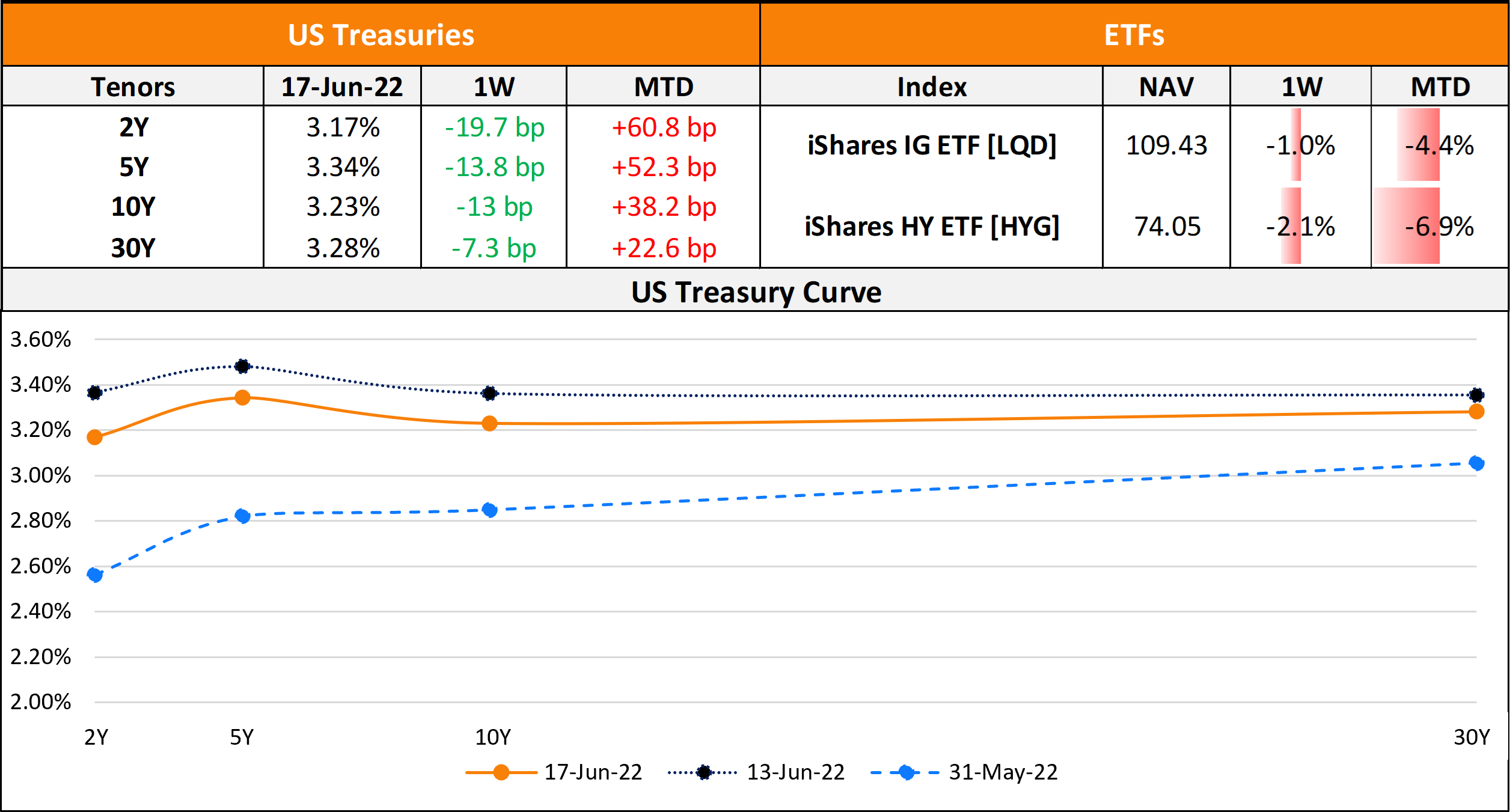 US primary markets were largely quiet on the back of the FOMC meeting on June 15. Total issuance stood at $957mn vs. $32.2bn in the week prior, with the chunk of the issuance coming from a single High Yield (HY) deal – Entegris’ $895mn 8Y bond. There were no new Investment Grade (IG) deals last week. US IG funds saw $8.7bn in outflows in the week ended June 15 as per Lipper data, following a pullback of $2.9bn in the week prior. Bloomberg notes that this marks twelve straight weeks of outflows, the longest streak of outflows going back to at least 1992, and the largest since March 2020. HY funds saw $5.7bn in outflows, the most since February 2018. In North America, there were a total of 16 upgrades and 8 downgrades combined across the three major rating agencies last week. LatAm saw no deals yet again for a third straight week. In South America, there were no upgrades and 3 downgrades across the major rating agencies. EU Corporate G3 issuance dropped by over 50% to $10.6bn vs. $22.6bn in the week prior – ING Groep raised €4.5bn via a two-trancher to lead the table, followed by Credit Suisse’s $1.65bn PerpNC5.5 AT1 issuance at an attractive yield of 9.75%. Across the European region, there were 9 upgrades and 2 downgrades across the three major rating agencies. The GCC G3 region saw no deals for a second consecutive week. Across the Middle East/Africa region, there were no upgrades and 5 downgrades across the three major rating agencies. The APAC ex-Japan G3 region saw only $395mn worth of new deals vs. $6.7bn in the week prior – China Development Bank (Hong Kong) raised €100mn followed by Linyi Investment and Shanxi Xinxian raising $100mn each. In the APAC region, there was 1 upgrade and no downgrades combined across the three major rating agencies last week.