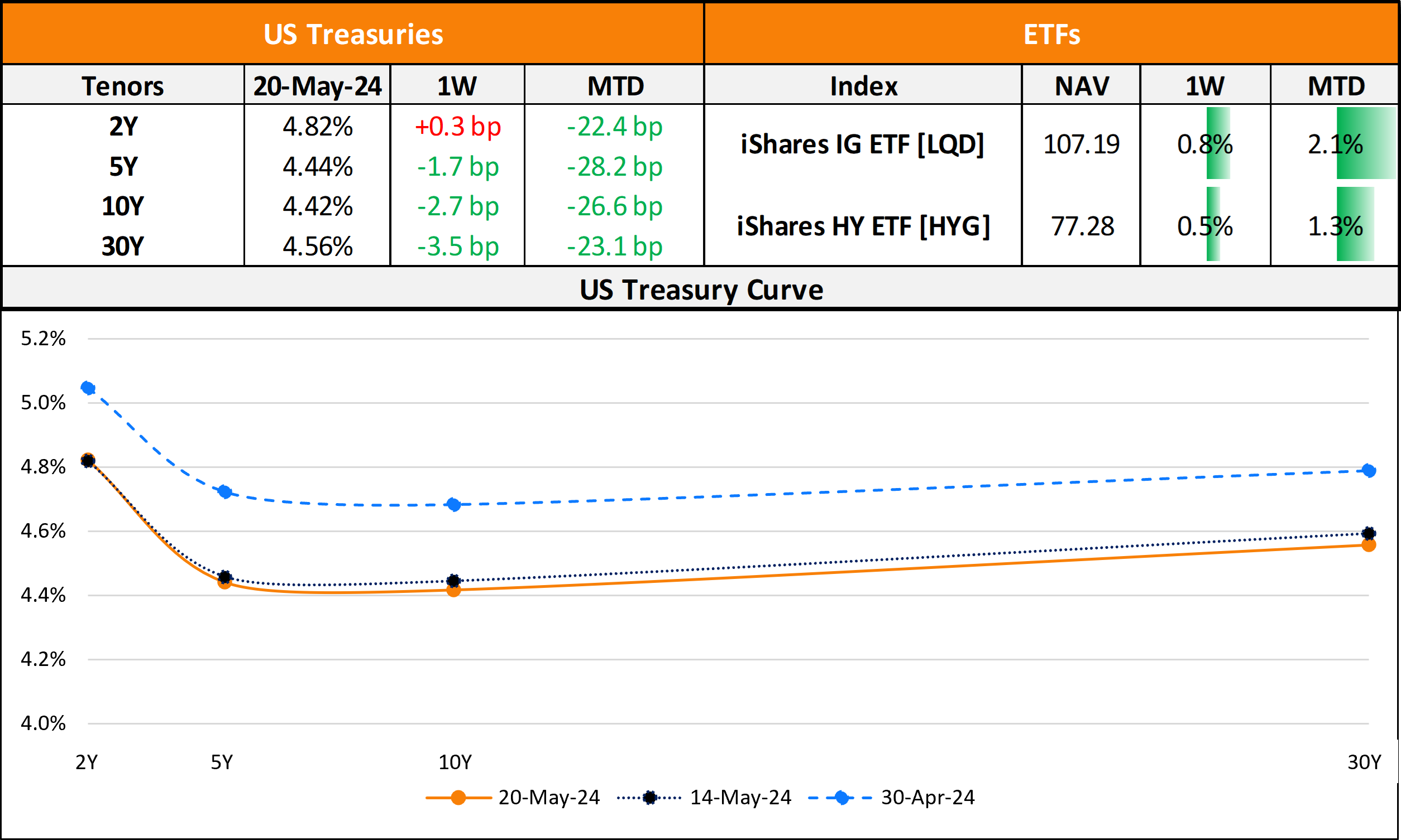 EU Corporate G3 issuances recorded $43.4bn in new deals, higher than the $28.3bn seen in the week prior to it. The largest deals were led by Novo Nordisk’s $4.65bn and MSD Netherland’s $3.4bn four-tranchers each. The region saw 29 upgrades and 26 downgrades each across the three major rating agencies. The GCC dollar primary bond market saw no new deals last week after $2.2bn in issuances a week prior to it. In the Middle East/Africa region, there were 28 upgrades and 6 downgrades across the major rating agencies. LatAm saw $500mn in new deals, lower than the $750mn from a week ago, with a solo issuance by Trident Energy’s $500mn deal. The South American region saw no upgrades and 2 downgrades across the rating agencies