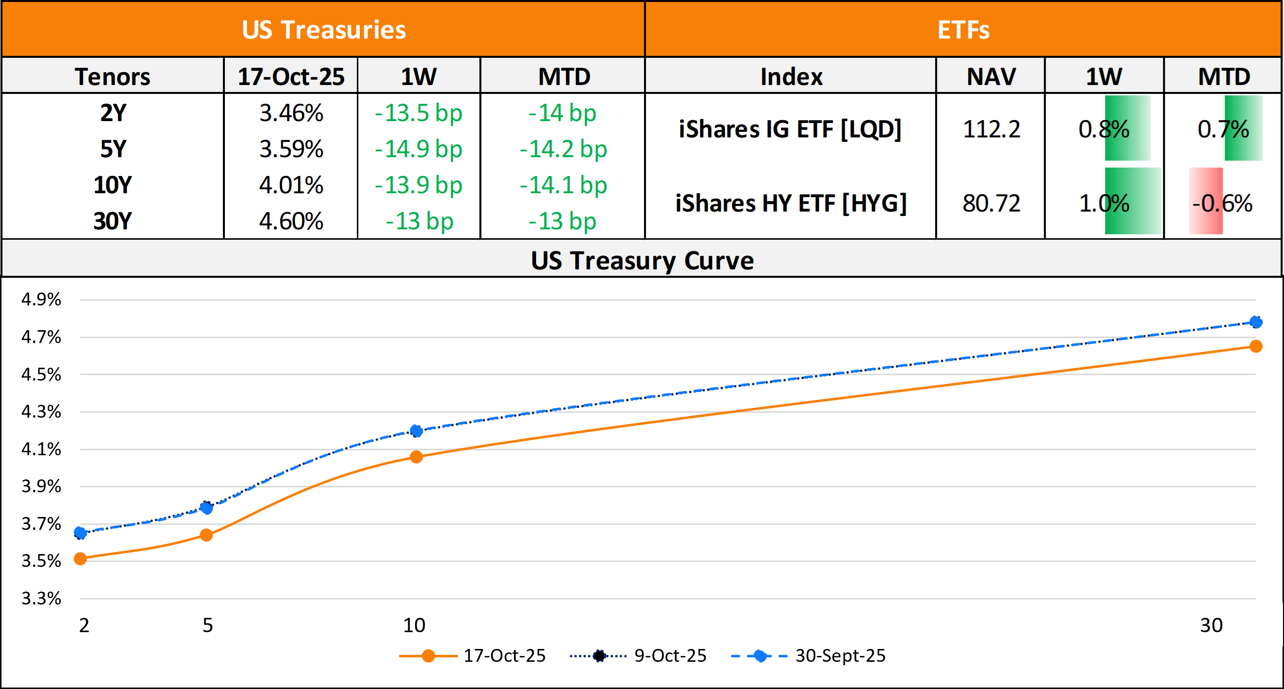 US primary market issuances jumped higher last week to $31bn vs. $16bn in new deals seen a week prior to it. IG issuers took up $27bn of the total, led by the big banks – Goldman Sachs’ $10bn five-trancher, Morgan Stanley’s $8bn four-trancher and JPMorgan’s $5bn two-tranche deal led the tables. HY deals stood at $3.9bn, led by WULF Compute’s $3.2bn issuance and Ferrellgas Partners’ $650mn issuance. In North America, there were a total of 34 upgrades and 26 downgrades, across the three major rating agencies last week. US IG funds saw $2.2bn in inflows during the week ended October 15, adding to the $3.3bn inflows seen during the week before that. US HY bond funds saw $1.3bn in outflows, reversing the $2.1bn inflows seen in the prior week.