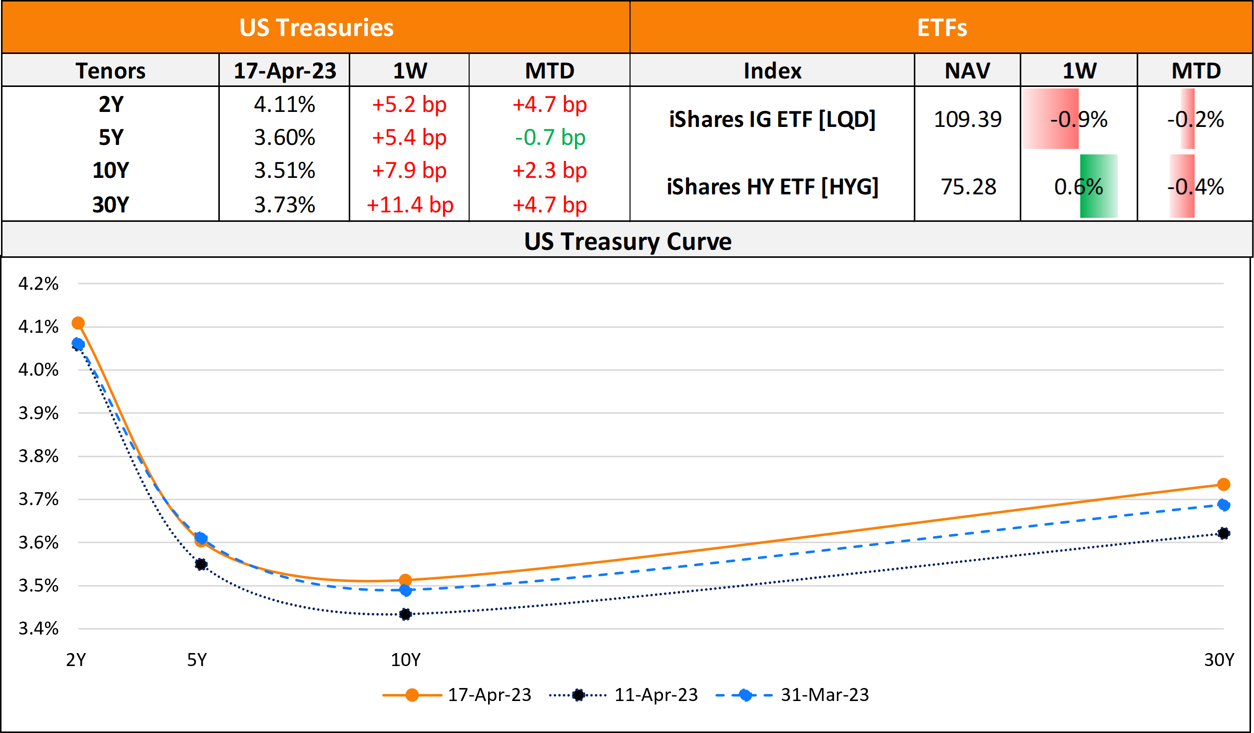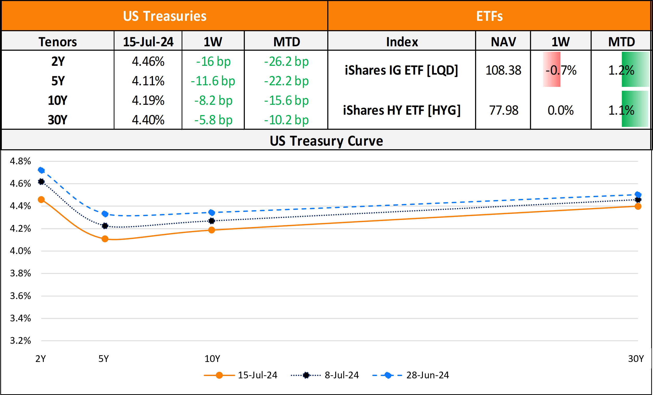 US primary market issuances jumped to $43.6bn last week from only $9.85bn in the week prior to it. IG issuers took up $40.4bn of the total, led by big banks after their earnings reports. JPMorgan’s $9bn and Morgan Stanley’s $8bn four-part deals each, were followed by Goldman Sachs’ $5.5bn two-trancher topping the tables. HY issuers accounted for $3bn of the volume with SM Energy’s $1.5bn two-trancher and Summit Midstream’s $575mn deals leading the tables. In North America, there were a total of 24 upgrades and 42 downgrades across the three major rating agencies last week. US IG funds saw inflows of $1.30b for the week ending July 17 compared to $38.4mn of inflows seen in the prior week. HY funds saw $2.64bn in inflows, adding to the $675.5mn inflows seen a week before this.