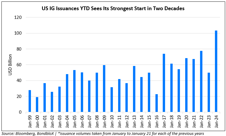 US primary markets continued to stay busy, with $54.6bn in new deals last week vs. $27.9bn a week prior to that. IG issuers racked up $46.2bn in deals led by JPMorgan and Wells Fargo’s $8.5bn and $8bn four-trancher deals each. HY issuers accounted for $8.3bn of the volume with CSC Holdings’ $2.05bn issuance and HUB International’s $1.9bn deals leading the tables. In North America, there were a total of 13 upgrades and 32 downgrades across the three major rating agencies last week. US IG funds saw $227mn in inflows for the week ending January 17, adding to the $838mn seen a week before that. HY funds saw $1bn in inflows during the same period, adding to the $523mn seen a week prior. With primary markets off to a strong start globally, the US IG-space has in particular seen its strongest start in over two decades as per Bloomberg data. FT reported that this was its best start since records going back to 1990.