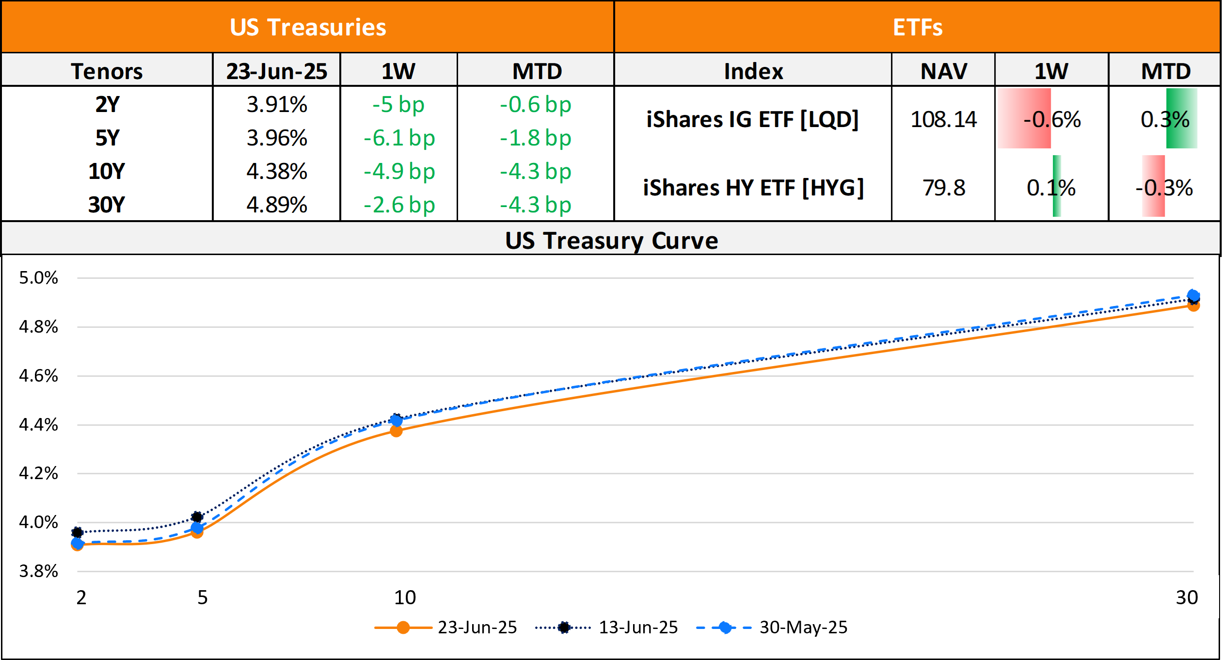 US primary market issuances jumped slightly to $20.7bn vs. $18.8bn in the previous week. IG issuers took up $14.3bn of the total, led by EOG Resources’ and Hyundai Motor’s $3.5bn issuance each, followed by United Health’s $3bn four-trancher deal. HY issuances stood at $7bn, led by Lumen Technologies’ $2bn issuance and Connect Holding’s $1.15bn two-part deal. In North America, there were a total of 34 upgrades and 41 downgrades each, across the three major rating agencies last week. US IG funds saw $929.6mn in inflows during the week ended June 18, adding to the $2.3bn inflow seen during the week before that. US HY bond funds saw $356.3mn of inflows, adding to the $1.1bn inflows in the prior week.