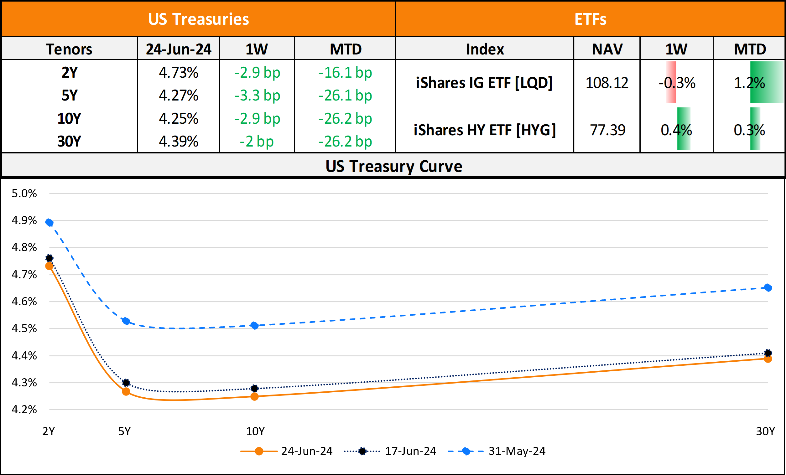 US primary market issuances rose sharply last week, with new deals at $27.5bn vs. only $7.7bn seen a week before. IG issuers took up $25.1bn of the total led by Home Depot’s jumbo $10bn nine-trancher and Hyundai Capital’s $3.75bn five-tranche issuance. HY issuers accounted for $2.4bn of the volume with Masterbrand’s $700mn issuance, followed by Hertz’s and Blackstone’s $500mn deals each leading the tables. In North America, there were a total of 32 upgrades and 28 downgrades across the three major rating agencies last week. US IG funds saw a $433mn outflow for the week ending June 19, reversing some of the $960mn inflow seen in the week before this. HY funds saw $80.1mn in inflows, adding to the $13.8mn inflows seen a week prior.