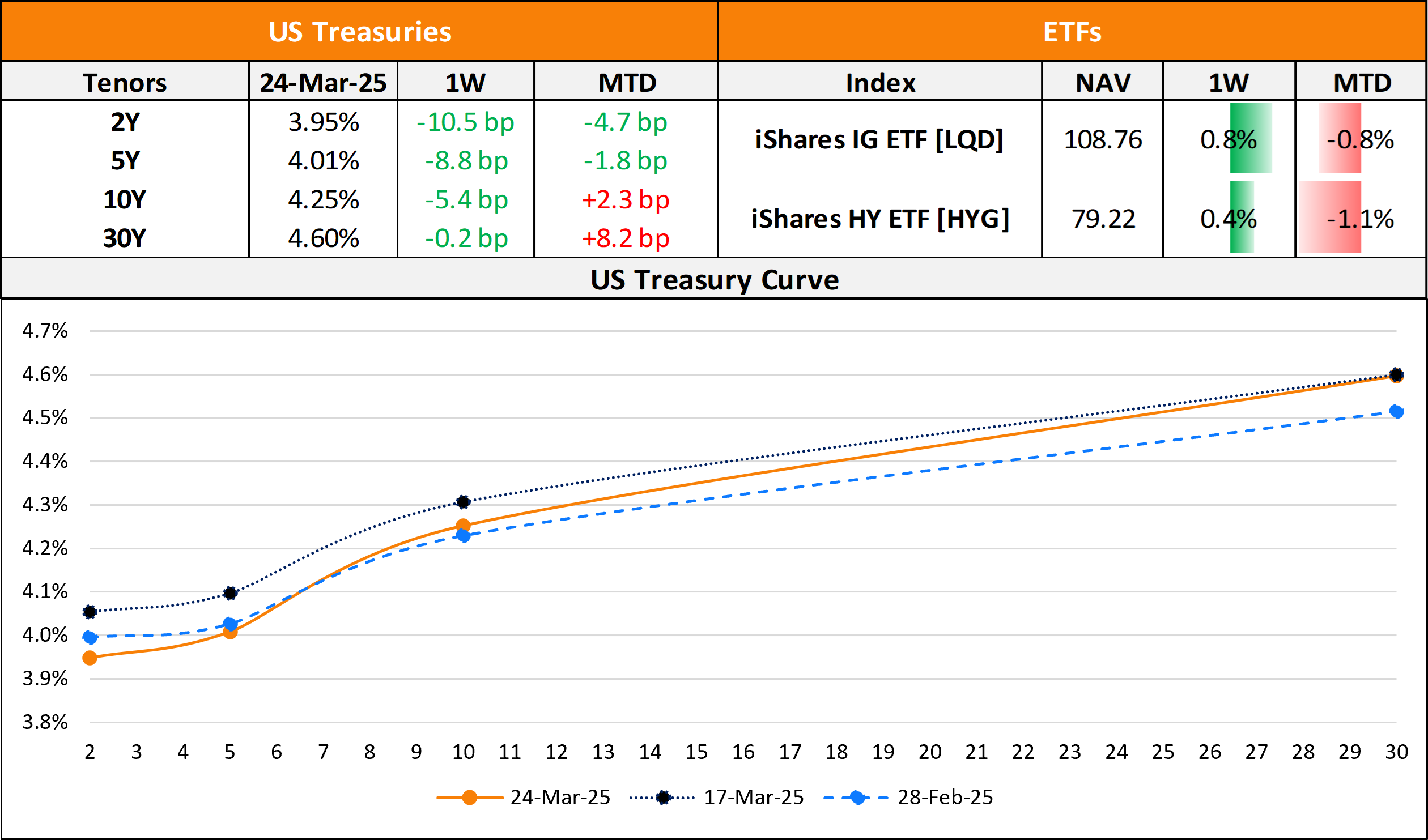 US primary market issuances stood at $24.1bn in the previous week, broadly steady as compared to $24bn seen a week prior to it. IG issuers took up $19.1bn of the total, led by Citigroup’s $2.25bn deal, followed by Ford’s $2.1bn three-part deal and Oncor Electric’s $1.3bn two-trancher. HY issuances stood at $3.2bn with XPLR Infrastructure’s $1.75bn two-part deal and Sunoco’s $1bn issuance deal leading the tables. In North America, there were a total of 47 upgrades and 43 downgrades each, across the three major rating agencies last week. US IG funds saw $336mn in inflows during the week ended March 19, adding to the $943mn inflows seen during the week before that. US HY funds saw $1.1bn in inflows during the same period, reversing the $569mn in outflows seen during the week before that. CDS spreads across most regions are at their highest level this month, led by the sell-off in equity markets and dampening risk sentiment.