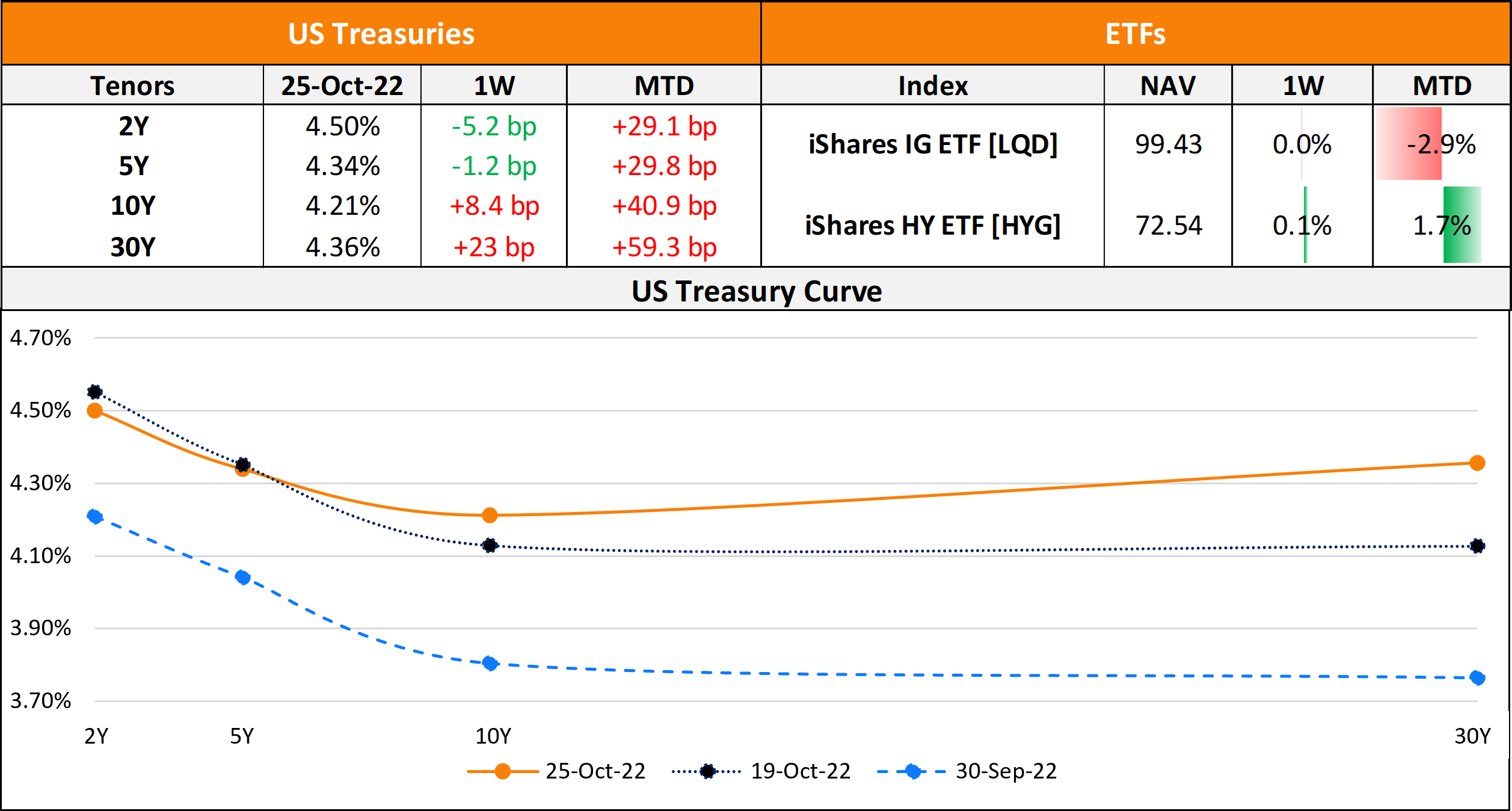 US primary market issuances were higher at $15.4bn vs. $6.9bn in the week prior, with IG issuances seeing $13.3bn in deals led by Lockheed Martin’s $4bn five-trancher and US Bancorp’s $3bn dual-trancher. High Yield deals stood at $2bn with Carnival’s deal being the sole issuance. In North America, there were a total of 50 upgrades and 38 downgrades across the three major rating agencies last week. As per Lipper data, US IG funds saw a massive $3.6bn in outflows in the week ended October 19, a ninth straight week of outflows and HY funds saw $144mn in outflows. LatAm saw $1bn in deals last week vs. $1.15bn in the week prior with Uruguay being the sole issuer. In South America, there was 1 upgrade and 7 downgrades across the major rating agencies. EU Corporate G3 issuance rose to $24.8bn vs. $11.8bn one week prior – KfW’s €3bn deal, BPCF’s €1.75bn deal and SocGen’s €1.5bn deals led the tables. Across the European region, there were 36 upgrades and 58 downgrades. The GCC G3 primary bond market saw $6.7bn in issuances last week vs. no deals in the week prior – Saudi Arabia’s $5bn sukuk dual-trancher led the table. Across the Middle East/Africa region, there were 5 upgrades and 7 downgrade across the three major rating agencies. APAC ex-Japan G3 issuances were at $4.5bn vs. $2.1bn in the week prior led by Export Finance & Insurance Corp’s $1.5bn issuance, AIA Group’s $850mn deal and Industrial Bank of Korea’s $600mn issuance. In the APAC region, there were no upgrades and 17 downgrades combined across the three rating agencies last week.
