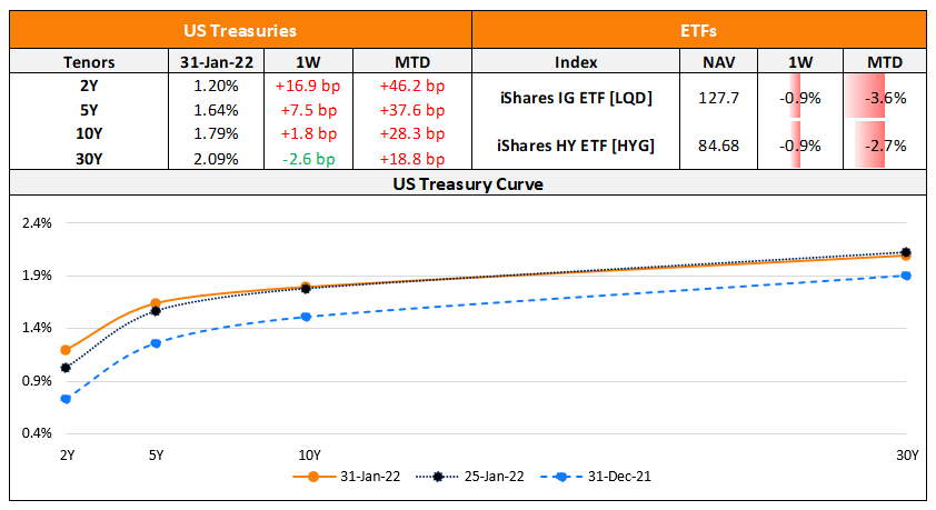 G3 issuance volumes from APAC ex-Japan stood at $3.1bn last week vs. $100mn a week prior to it with Westpac raising $1.5bn via a two-trancher, KHFC’s $500mn deal and Shinhan Card’s $300mn issuance leading the tables. In the APAC region, there were 6 upgrades and 2 downgrades across the three rating agencies last week.
