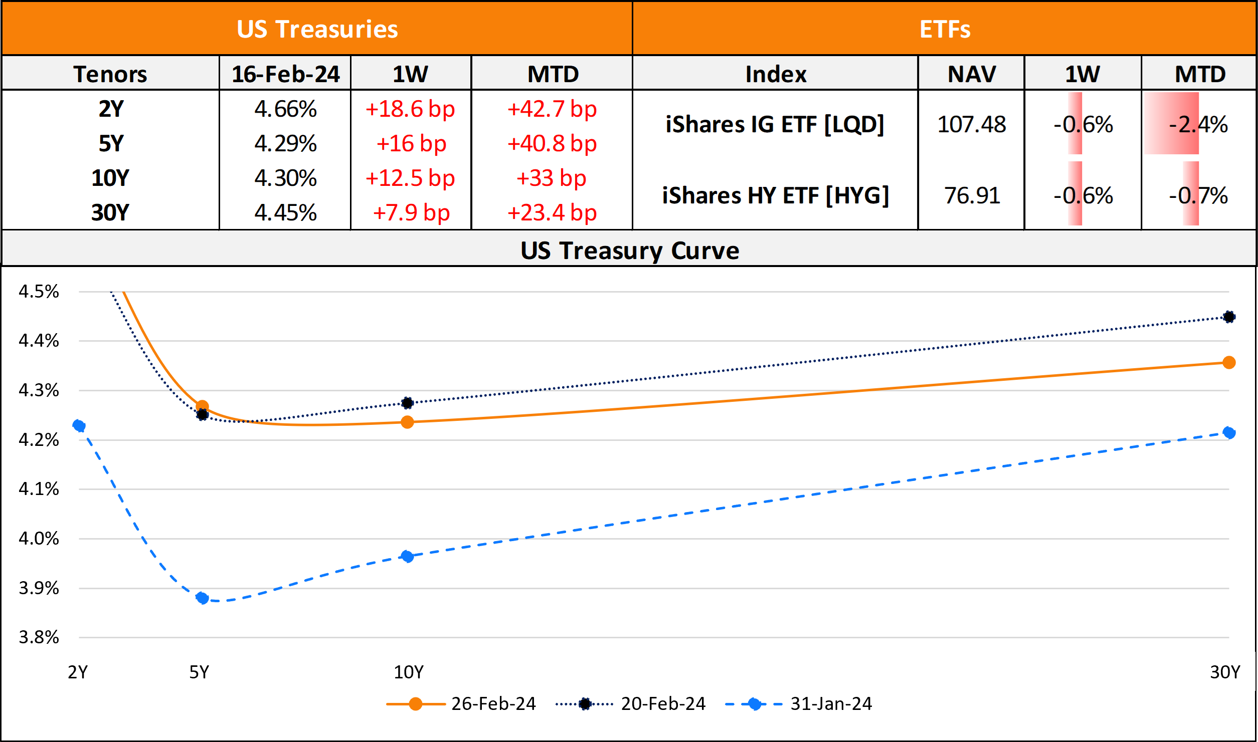 US primary markets continued to stay active, with new deals at $55.3bn vs. $37.7bn seen a week before this. IG issuers racked up $52.8bn in deals with AbbVie’s $15bn and Cisco’s $13.5bn seven-part deals leading the tables. HY issuers accounted for just $2.3bn of the volume with Royal Caribbean Cruises’ $1.25bn issuance and EQN Midstream’s $600mn leading the tables. In North America, there were a total of 63 upgrades and 30 downgrades across the three major rating agencies last week. US IG funds saw $2.3bn in inflows for the week ending February 21, adding to the $2.3bn seen a week before that. HY funds saw $10.9mn in inflows during the same period, reversing the $89mn in outflows seen a week prior.