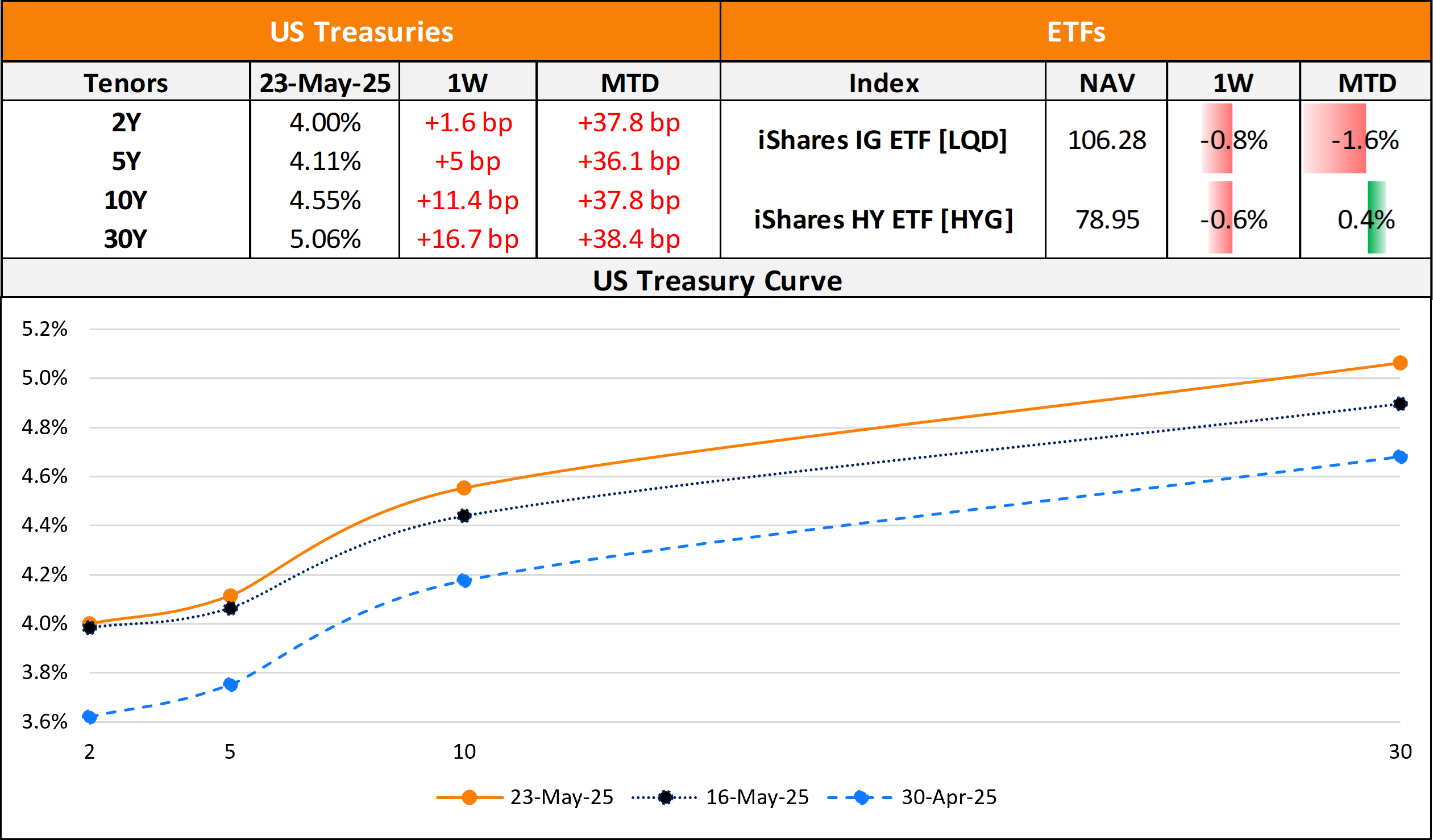 US primary market issuances jumped to $26bn vs. $39.9bn in the previous week. IG issuers took up $18.6bn of the total, led by Citibank’s $4bn four-trancher and Mckesson Group’s $2bn three-part issuance. HY issuances stood at $7.3bn, led by CoreWeave’s $2bn issuance and Sabre Corp’s $1.33bn deal. In North America, there were a total of 54 upgrades and 86 downgrades each, across the three major rating agencies last week. US IG funds saw $1.5bn in inflows during the week ended May 21, adding to the $1.9bn inflow seen during the week before that. US HY bond funds saw investors pour-in $1.2bn, adding to the $2.6bn inflows in the prior week.